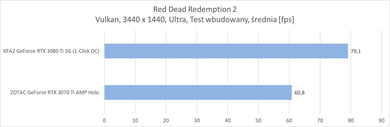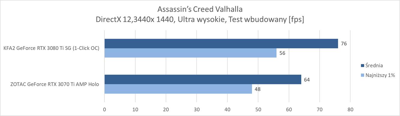 Tym razem wybór padł na ZOTAC GeForce RTX 3070 Ti AMP Holo, którego test znajdziecie tutaj. Karta na pewno bardzo dobrze wygląda, ma spory potencjał ręcznego OC i jest też fabrycznie podkręcona. Jej wyniki powinny więc dobrze przedstawiać wydajność RTX 3070 Ti w rozdzielczości 3440 x 1440. Grafika ma jednak jedną wadę – słabą kulturę pracy pod obciążeniem. Robi się ona głośna, co może wielu z Was przeszkadzać. Szkoda, że tutaj ZOTAC nie skupił się na tym elemencie. Warto też spojrzeć na ceny kart w sklepach, które powoli zaczynają spadać (kartę znalazłem nadal za 7299 zł, ale najtańsze modele RTX 3070 TI można znaleźć nawet za 5700 zł). Do cen sugerowanych długa droga, ale ważne, że sytuacja zaczyna się poprawiać.