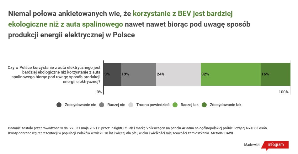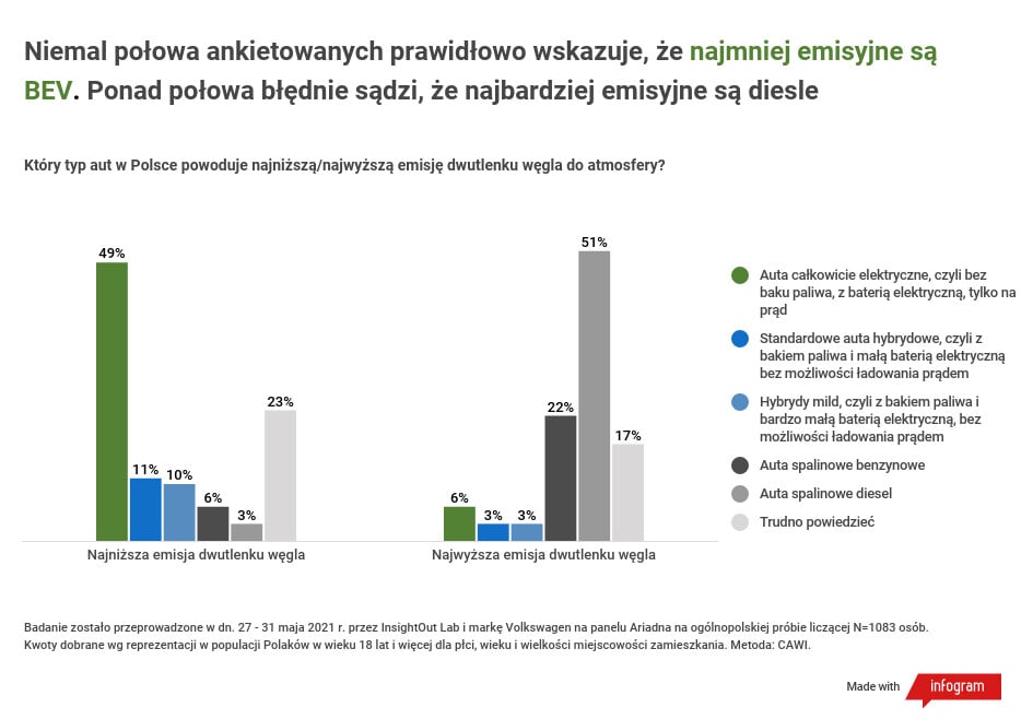 Z badania wynika, że połowa respondentów ma świadomość globalnych zagrożeń klimatycznych. Tyle samo zna różnice w emisji CO2 między autami w pełni elektrycznymi a pozostałymi rodzajami samochodów. To wskazuje, że wiedza o wpływie elektromobilności na środowisko potrzebuje jednak dalszej popularyzacji, bo wraz z postępem technologii samochody EV będą coraz bardziej ekologicznym rozwiązaniem.