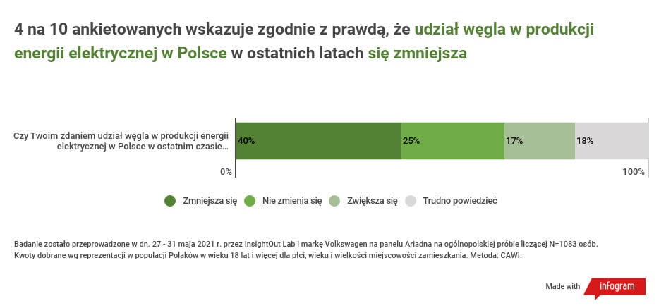 Badanie odpowiada na jedno z najważniejszych pytań, a więc to, czy jeżdżąc elektrykiem w Polsce, jeździmy samochodem “na węgiel”. Węgiel od lat jest dominującym źródłem energii elektrycznej w Polsce, ale okazuje się, że jego udział w produkcji prądu w ostatnich latach maleje a rośnie znaczenie odnawialnych źródeł energii. Jest tego jednak ciągle dużo, bo w 2020 roku Polska czerpała energię w 70% z węgla.