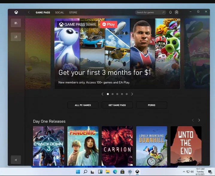 Ulepszenia dotknęły też działania konsoli Xbox w systemie Windows 11. Nowa aplikacja jest z nim zintegrowana oferując szybki dostęp do gier Xbox Game Pass, części społecznościowych i sklepu Xbox.