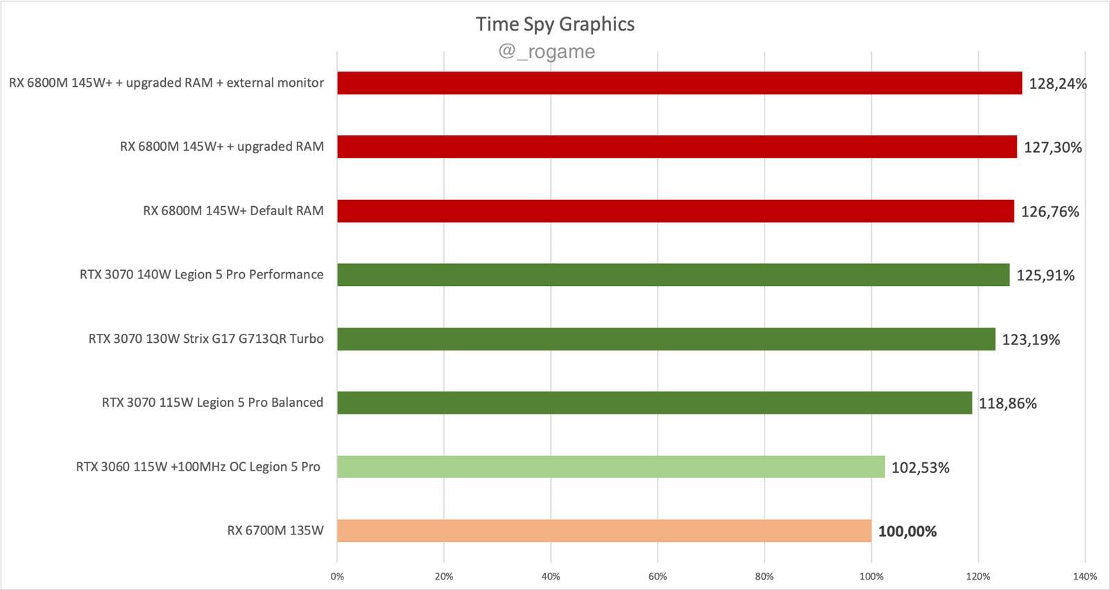 To jednak nie koniec, bo wyniki porównano również z flagowym RX 6800M oraz konkurencyjnymi GeForce RTX 3060, RTX 3070 (w 2 wariantach) i RTX 3060. W tym porównaniu, w którym udział wzięły laptopy wyłącznie na bazie procesora Ryzen 5000, karta AMD wypadła dobrze w jednym i źle w drugim teście. W praktyce powinna być idealną konkurencją dla RTX 3070.