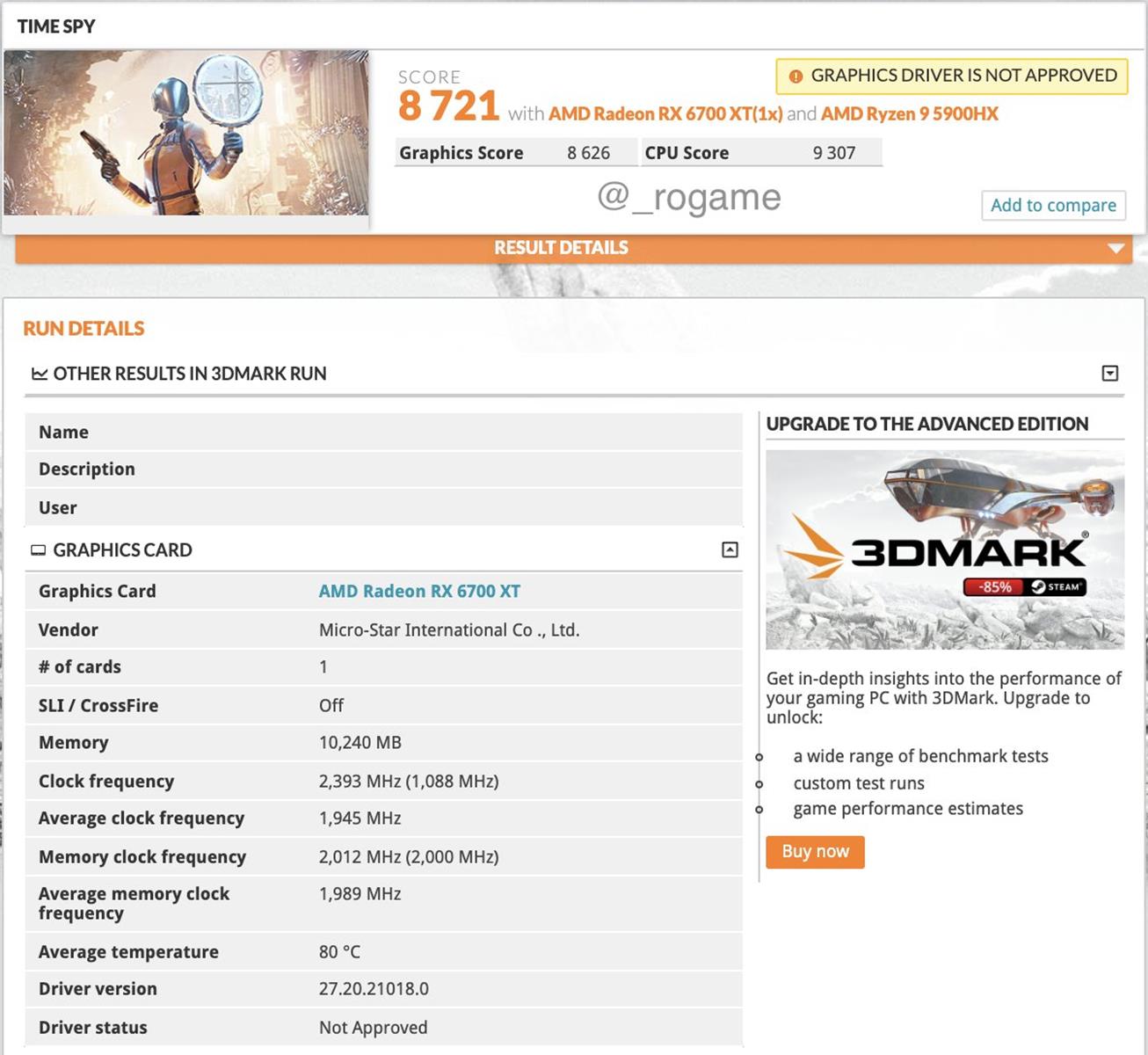 Co najciekawsze, oba te modele nie doczekały się nawet specjalnych, dedykowanych im sterowników w oficjalnym oprogramowaniu. Jednak najnowszy wyciek z Twittera ujawnił wydajność modelu ze średniego segmentu w Time Spy oraz Fire Strike w 3DMarku pod kątem graficznych możliwości. W nich Radeon RX 6700M zdobył kolejno 8628 i 27062 punktów, a jak wskazuje średnie taktowanie GPU na poziomie 1945-1987, oba testy wykonano zapewne na tym samym laptopie.