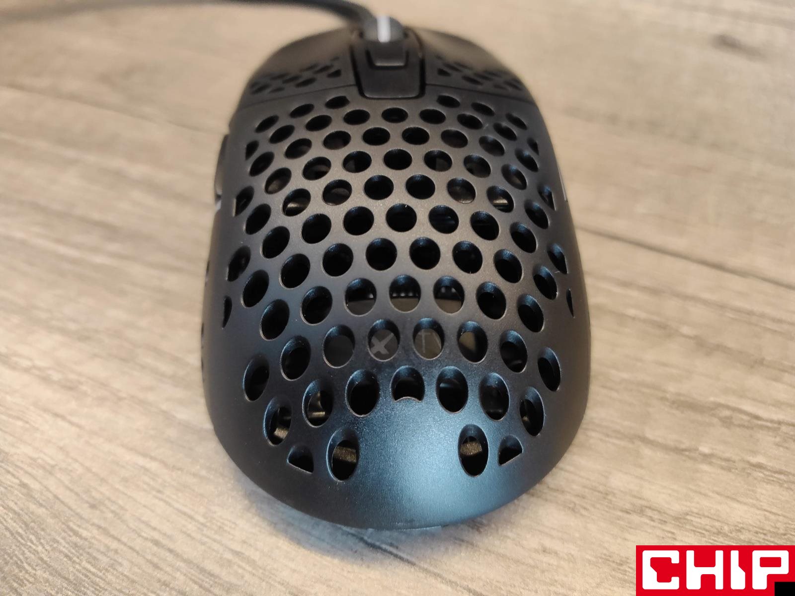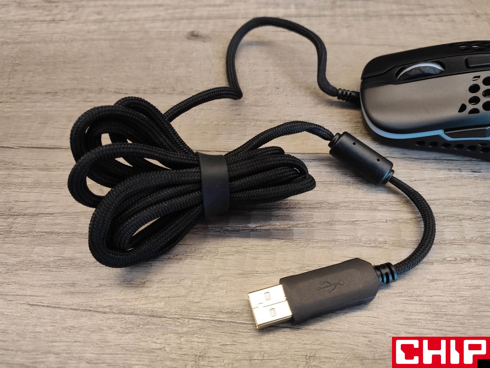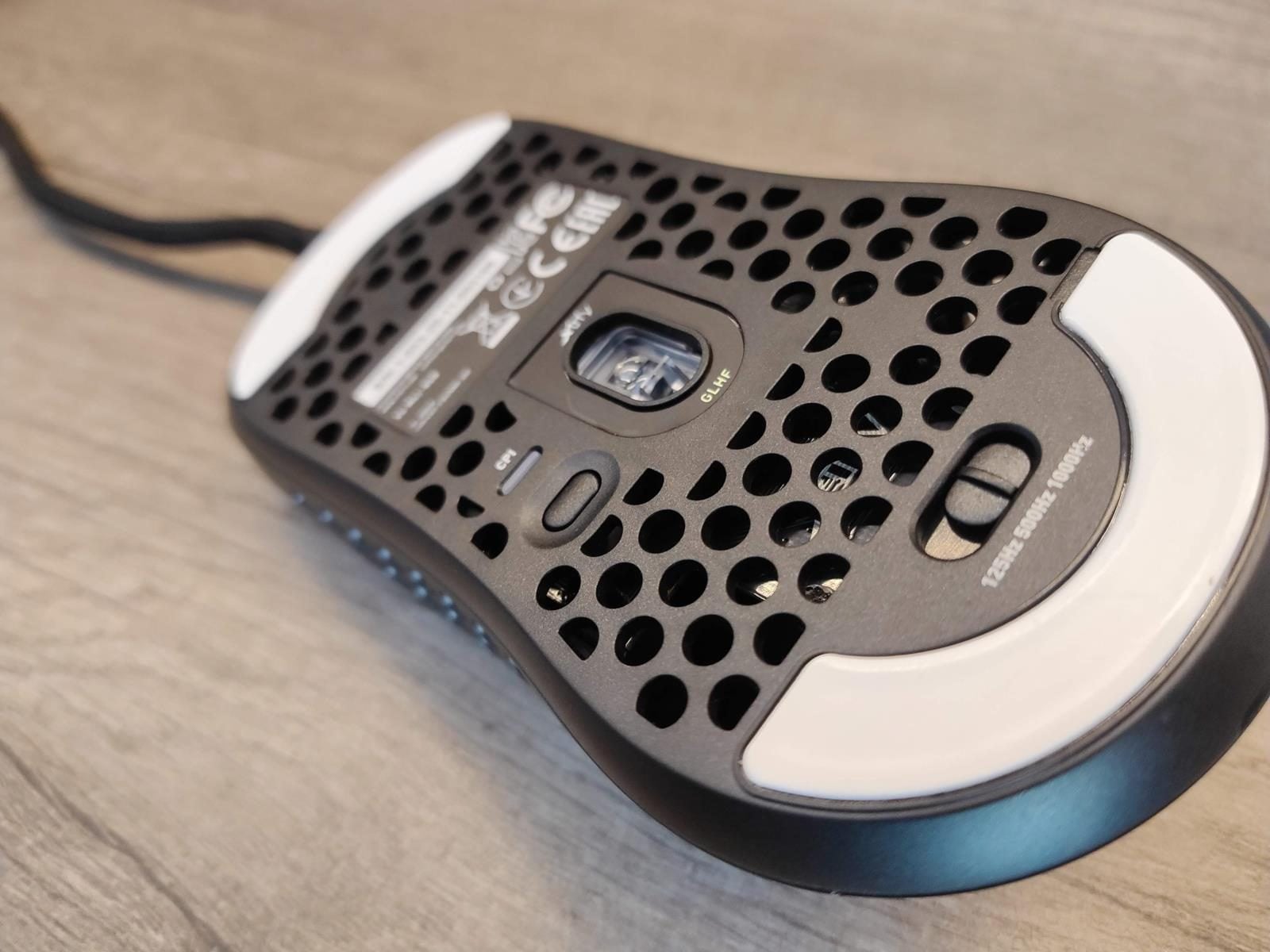 Na spodzie z kolei znajdziemy dwa białe ślizgacze z opcją doklejenia trzeciego wokół sensora, jak również przycisk zmiany DPI sygnalizowany konkretnym kolorem diody i przełącznik ustawiający częstotliwość odświeżania (125, 500, 1000 Hz). Wspomnianą wyżej lekkość akcentuje równie “lekki jak piórko” EZcord, czyli elastyczny, wpuszczony w myszkę materiałowy przewód przez gumową osłonkę skierowaną nieco w górę.