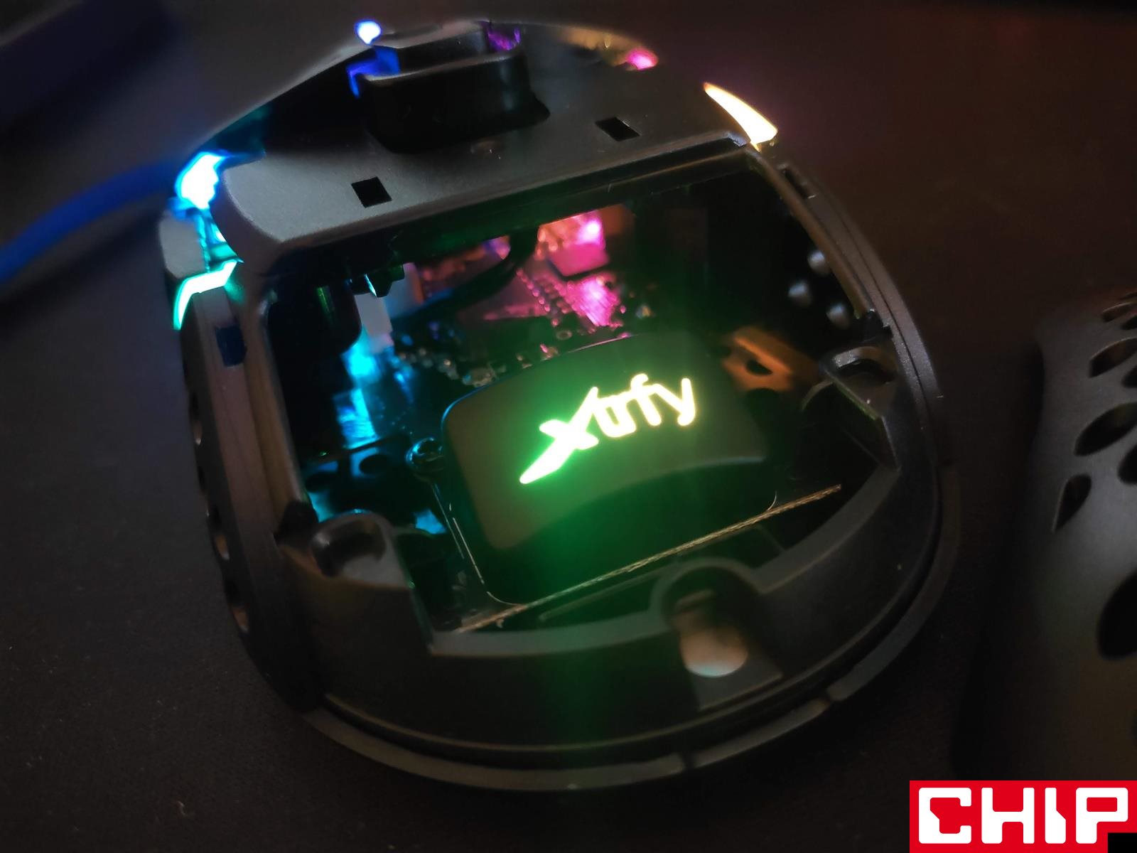 Dla Xtrfy model M42 RGB stał się poniekąd najbardziej masową myszką, sięgającą po trwający trend perforowanych obudów, prowadzących do lekkich myszek. To jednocześnie sprawia, że możemy dostrzec gołym okiem wszystko, co buduje myszkę “od wewnątrz”, ale spokojnie – nie musicie bać się o kurz i pot, bo cały laminat i poszczególne elementy zostały przed tym solidnie zabezpieczone. Warto też od razu wyjaśnić, że w teorii znacząco osłabiona obudowa tego modelu nie skrzypi, a panele nawet się nie uginają pod naciskiem