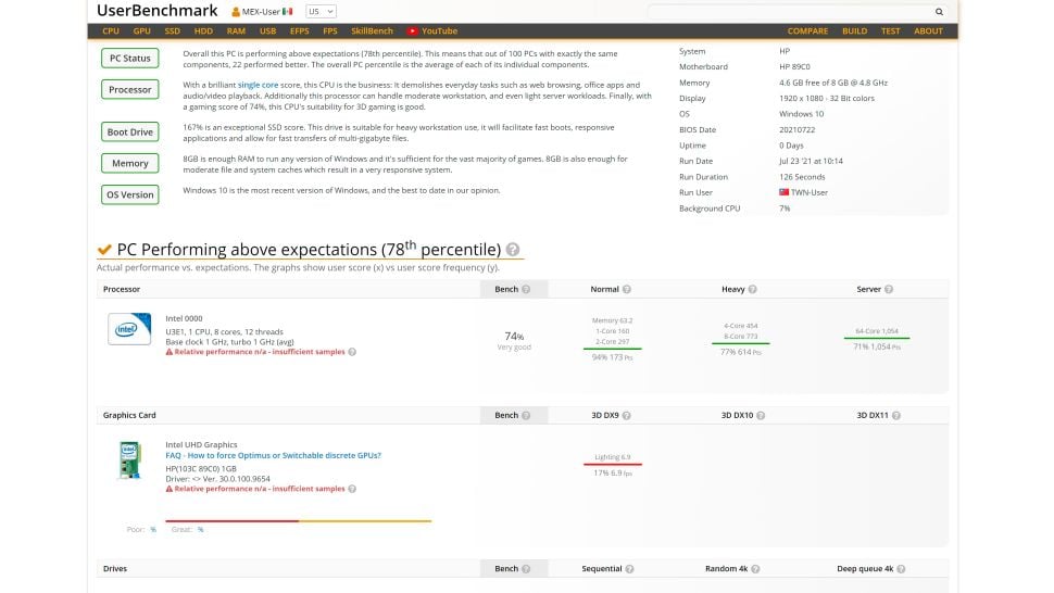W teście połączono go z 16 GB pamięci RAM DDR5-4800, gdzie osiągnął 1258 i 6831 punktów w kolejno teście jedno- i wielordzeniowym. W porównaniu ze średnimi wynikami AMD Ryzen 7 5800H z ośmioma rdzeniami (odpowiednio 1338 i 7063 punktów), ten procesor Intela oferuje mniejszą wydajność o kolejno 6 i 3%.
