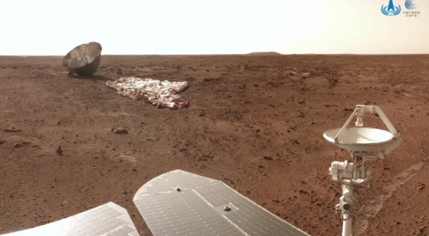 Zhurong wylądował na Czerwonej Planecie 14 maja, po tym, jak spędził na orbicie trzy miesiące. Łazik wykonał natomiast zdjęcia spadochronu i pancerza 12 lipca. Dokonał tego z odległości około 30 metrów.