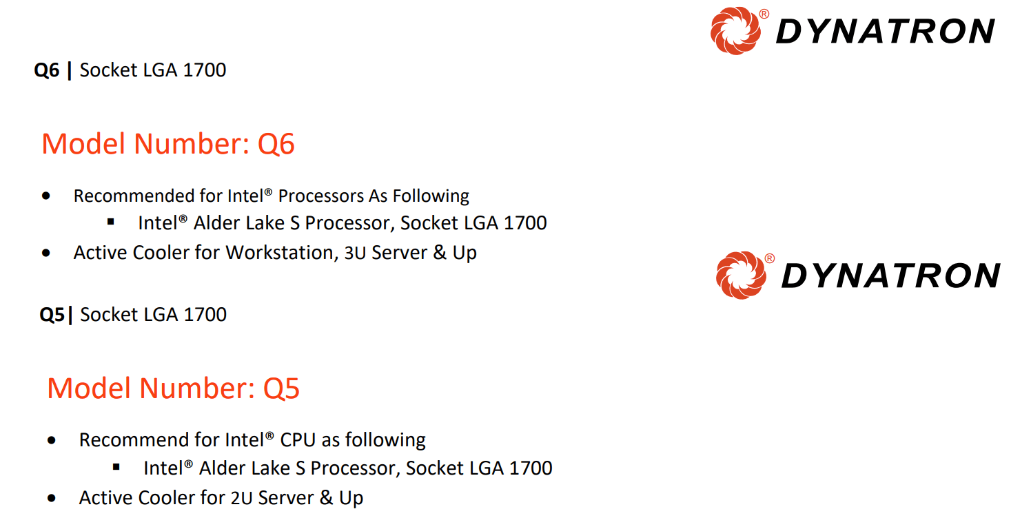 Jednak co ciekawe, amerykańska firma Dynatrom specjalizująca się w sprzęcie chłodzącym już dumnie ogłosiła, jakie poleca chłodzenia dla procesorów Intel Alder Lake-S. Mowa o Q5 i Q6, które są rzekomo kompatybilne z nowym gniazdem LGA1700 oraz Core 12. generacji. Producent wspomina o tym bezpardonowo, choć należy tutaj podkreślić, że oba modele są przeznaczone dla stacji roboczych i serwerów, a nie konsumenckiej/gamingowej serii Alder Lake-S.