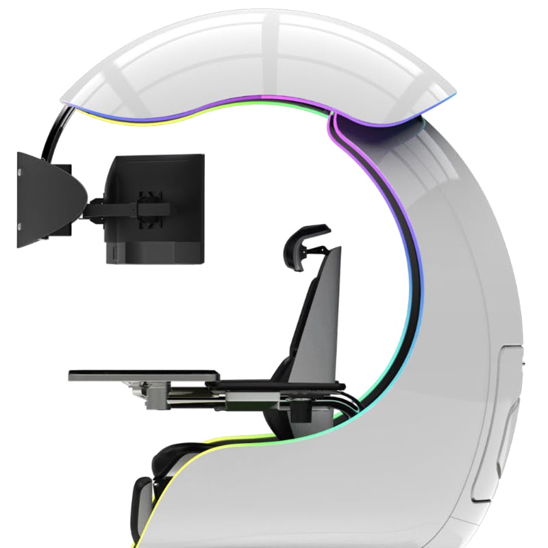 Jako sprzęt integrujący w sobie biurko, uchwyt na monitor i ergonomiczny fotel, ORB X GamePod stoi na solidnej podstawie i przypomina wielką kapsułę, która posiada tak rozbudowany system podświetlenia, że to wręcz przytłaczające. Przez to RGB zresztą całość sprawia wrażenie zabawki, a nie “wszechstronnej stacji roboczej z myślą o pełnej imersji”, zapewniającej prywatność, dzięki wpół zamkniętej konstrukcji kokpitu.