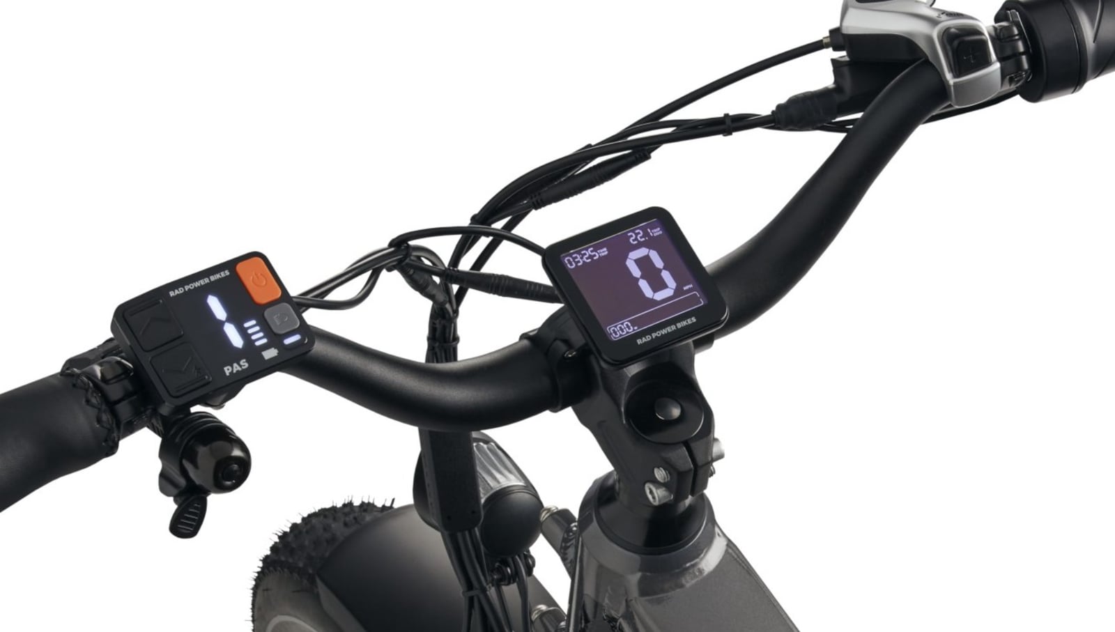 Przeróbce “na lepsze” doczekał się też stosunkowo mały wyświetlacz LCD na kierownicy. W rzeczywistości bowiem RadRover 6 Plus posiada dwa wyświetlacze. Ten główny na samym środku kierownicy wyświetla najważniejsze informacje (prędkość, moc, zasięg), podczas gdy ten po lewej stronie zapewnia informacje o stopniu wspomagania pedałowania, czy poziomu naładowania akumulatora.
