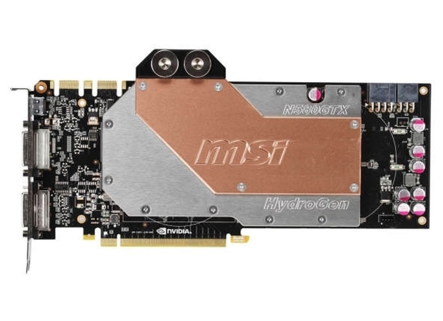 W 2011 roku MSI pokazało swoją wyjątkową kartę GeForce GTX 580 Hydrogen. Ta przy skromnych 512 rdzeniach CUDA i taktowaniu bazowym 1645 MHz mogła cieszyć się niską temperaturą gwarantowaną przez dosyć duży blok wodny z miedzi. Ten blok zakrywał nie tylko rdzeń graficzny, ale też sekcje zasilania i układy 1536-MB pamięci GDDR5.