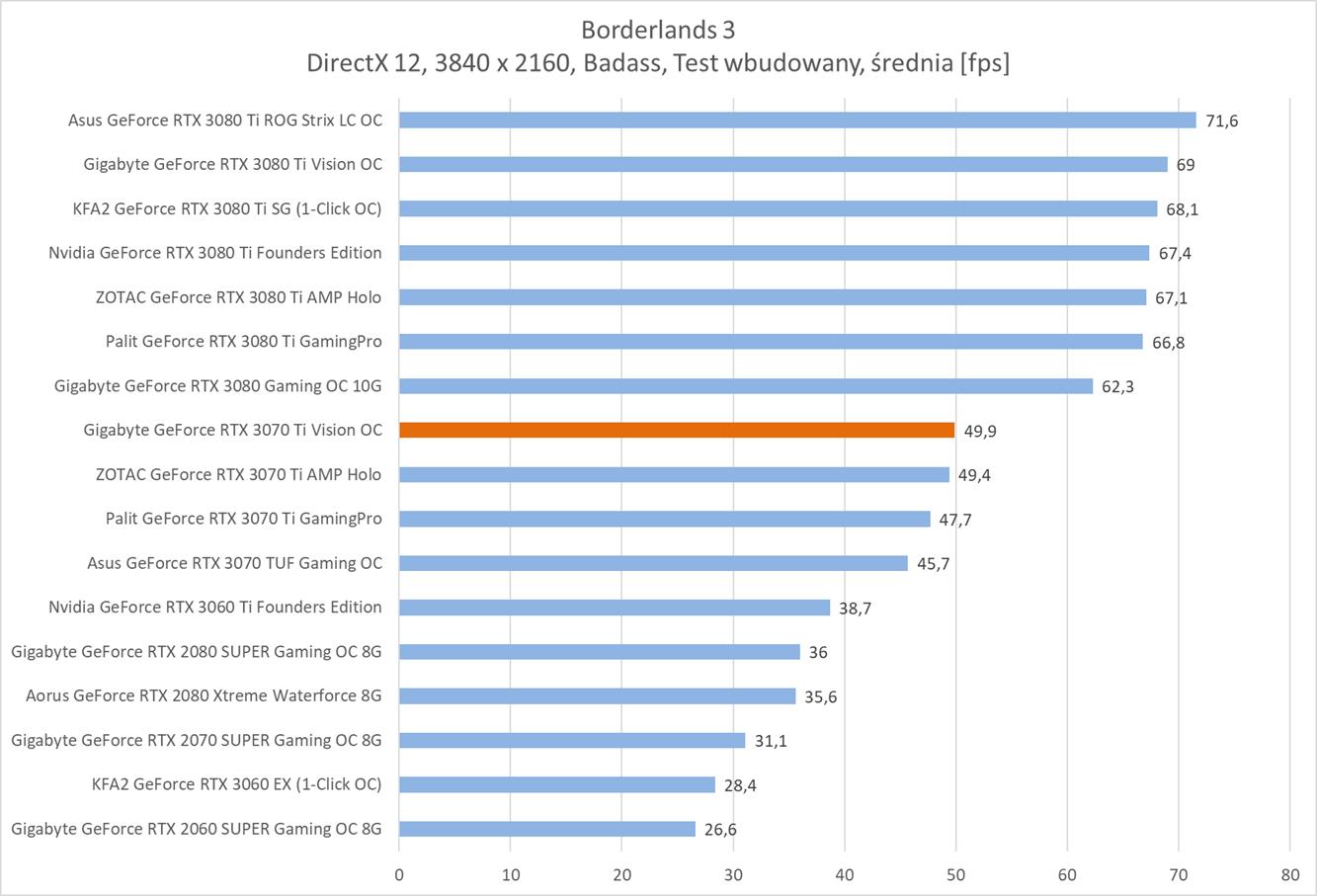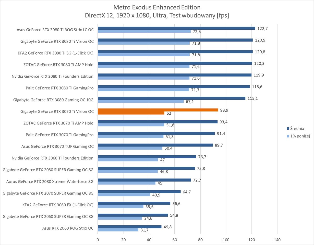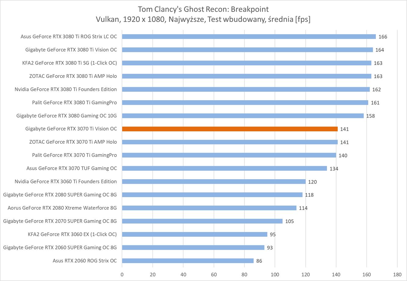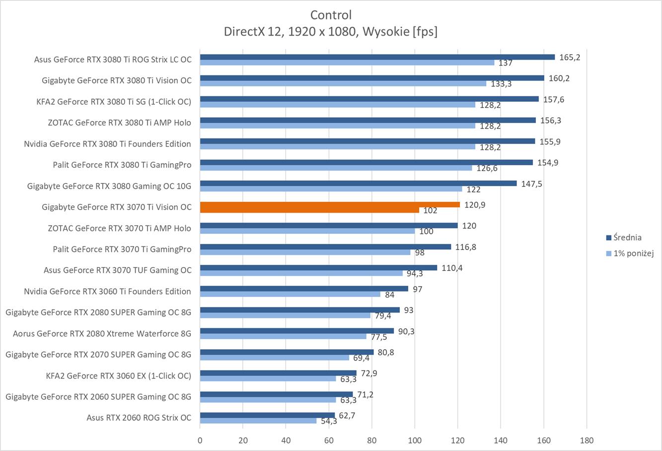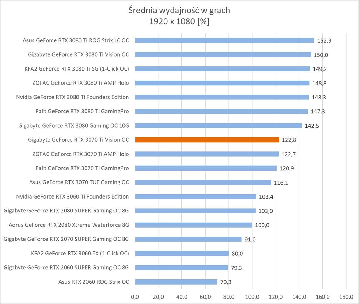 Testowana karta oczywiście bez problemów poradziła sobie z grami w rozdzielczości 1920 x 1080. Warto jednak zauważyć, że znacznie odstaje ona od RTX 3080 i tak naprawdę sam RTX 3070 Ti powinien oferować lepsze wyniki.