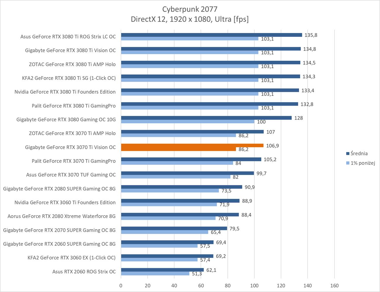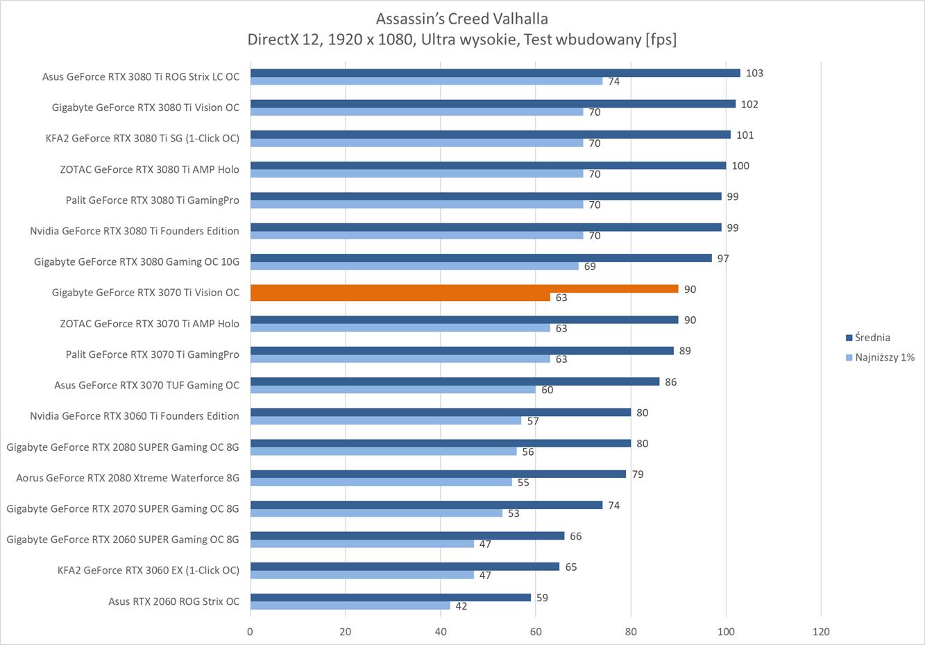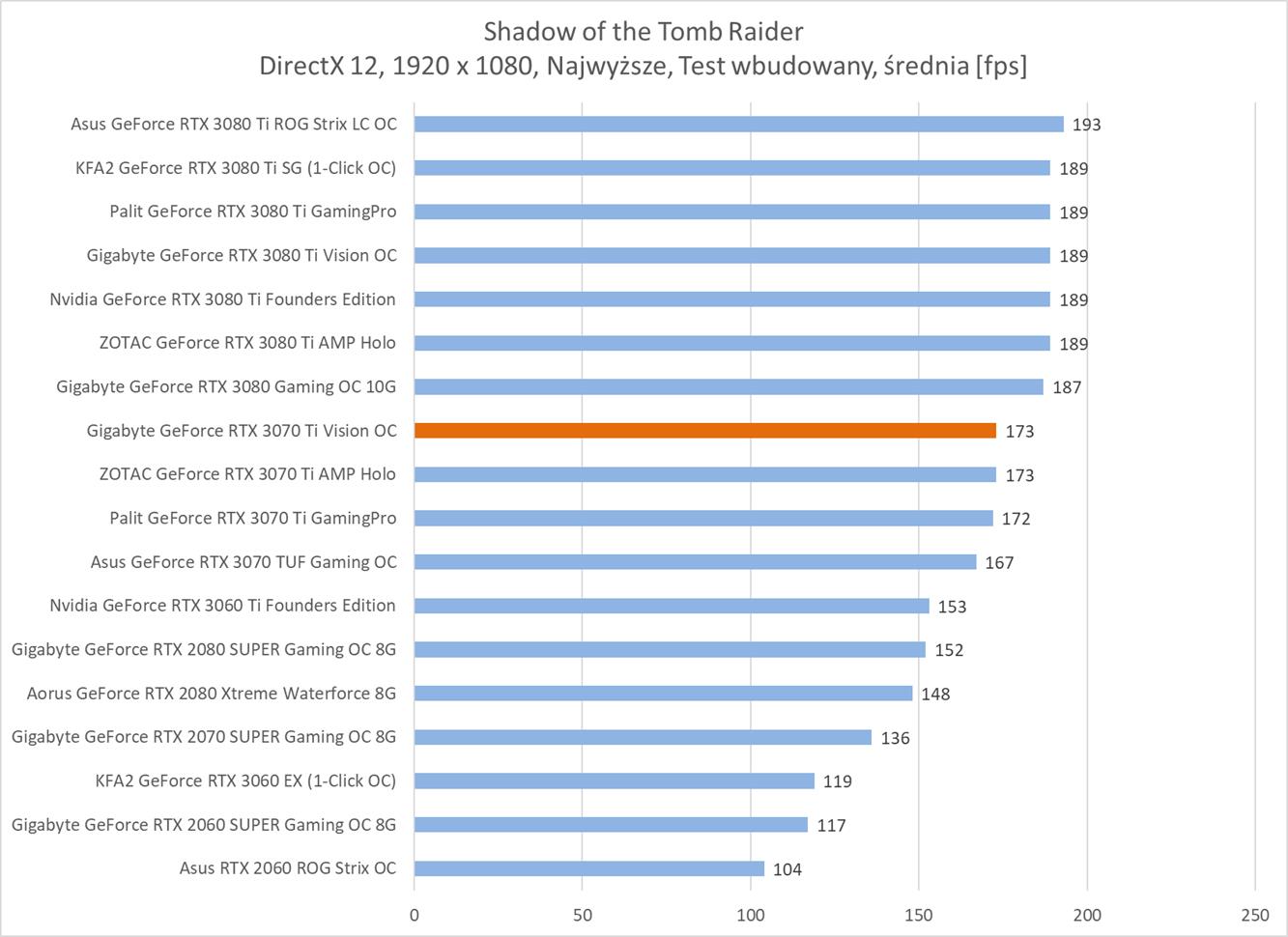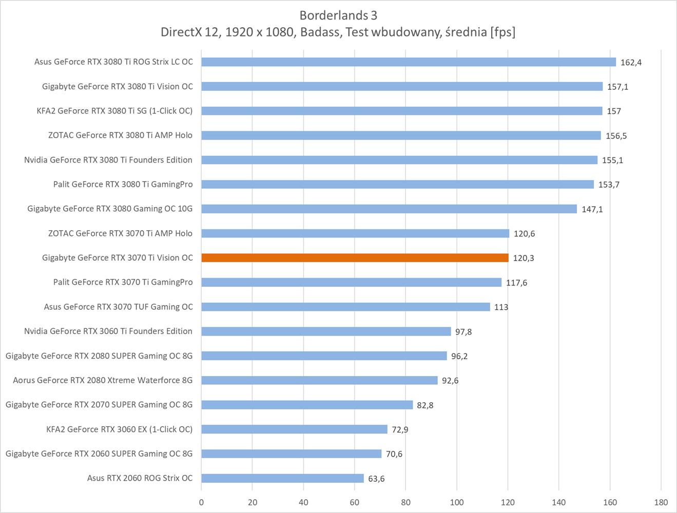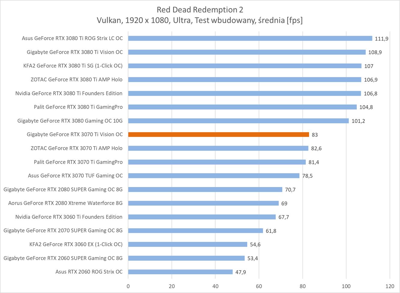 Testowana karta oczywiście bez problemów poradziła sobie z grami w rozdzielczości 1920 x 1080. Warto jednak zauważyć, że znacznie odstaje ona od RTX 3080 i tak naprawdę sam RTX 3070 Ti powinien oferować lepsze wyniki.