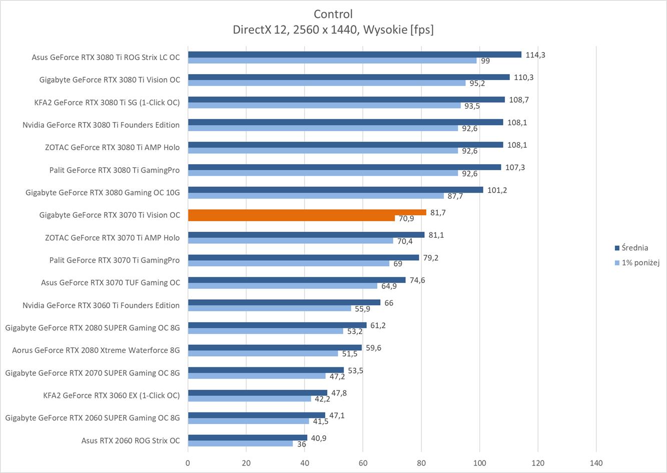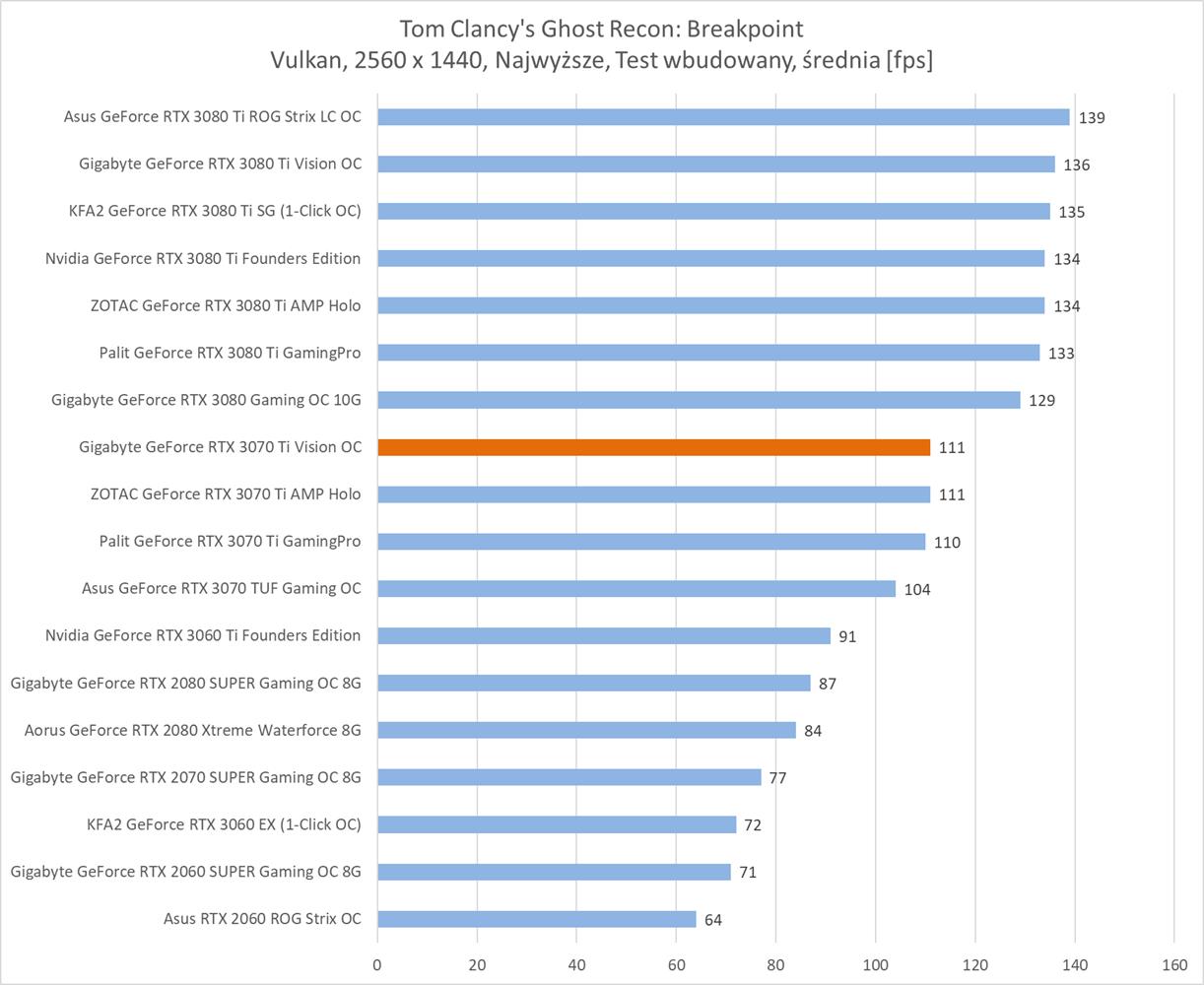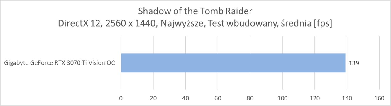 W kolejnej rozdzielczości ponownie Gigabyte GeForce RTX 3070 Ti Vision OC zanotował średnio powyżej 60 fps w każdym tytule. Wyniki są też bardzo podobne do modelu ZOTACa, więc tutaj nie ma żadnego zaskoczenia.