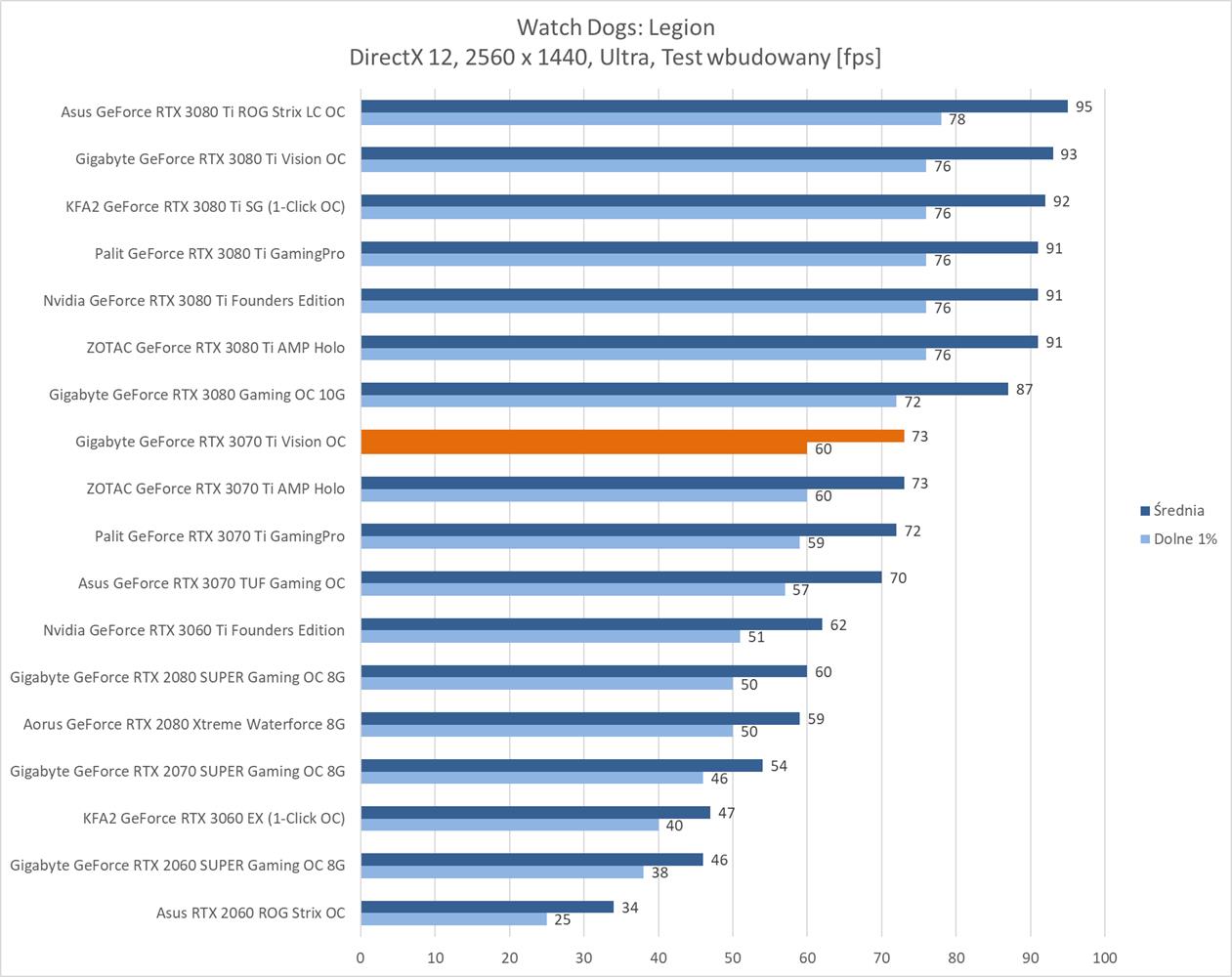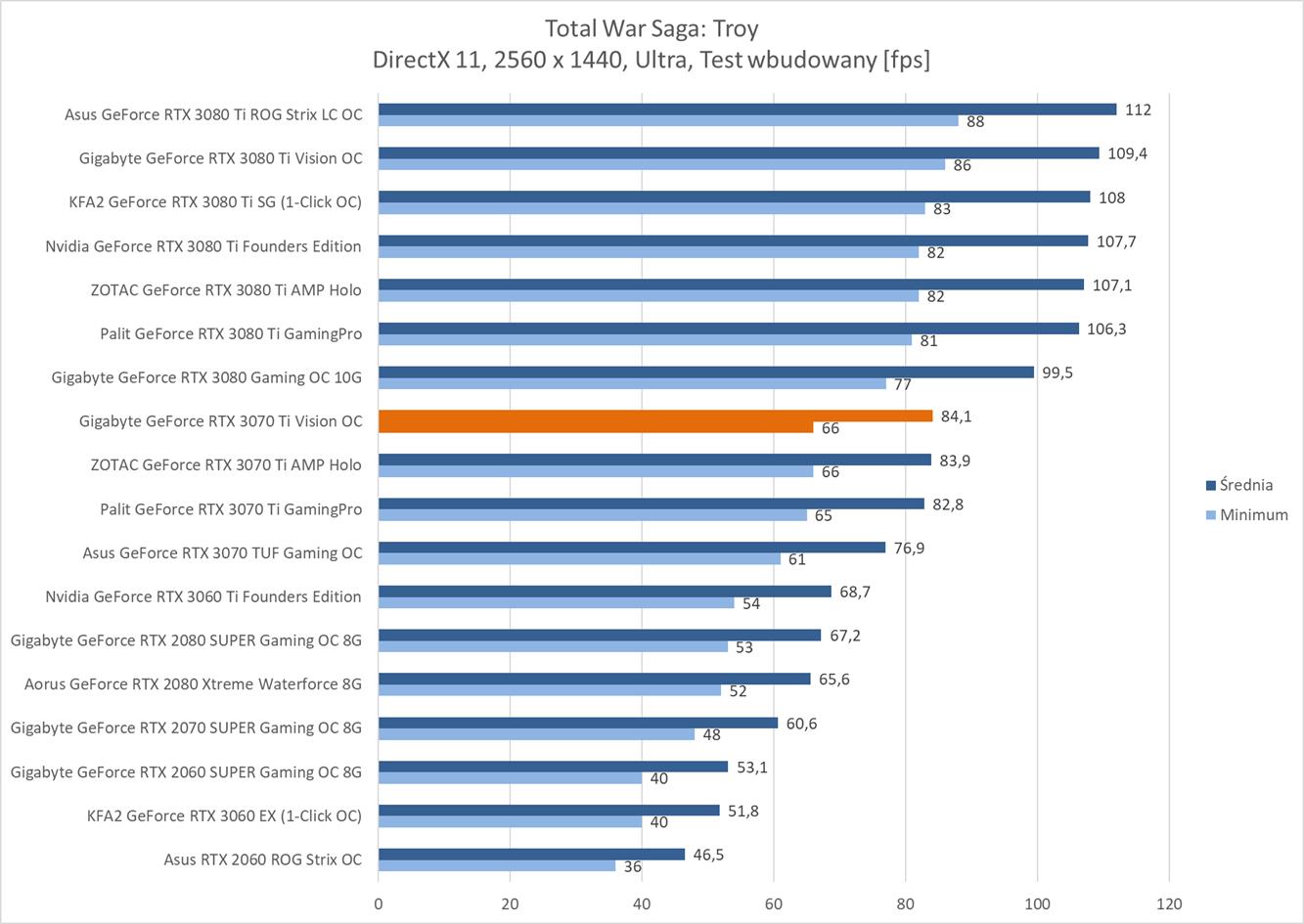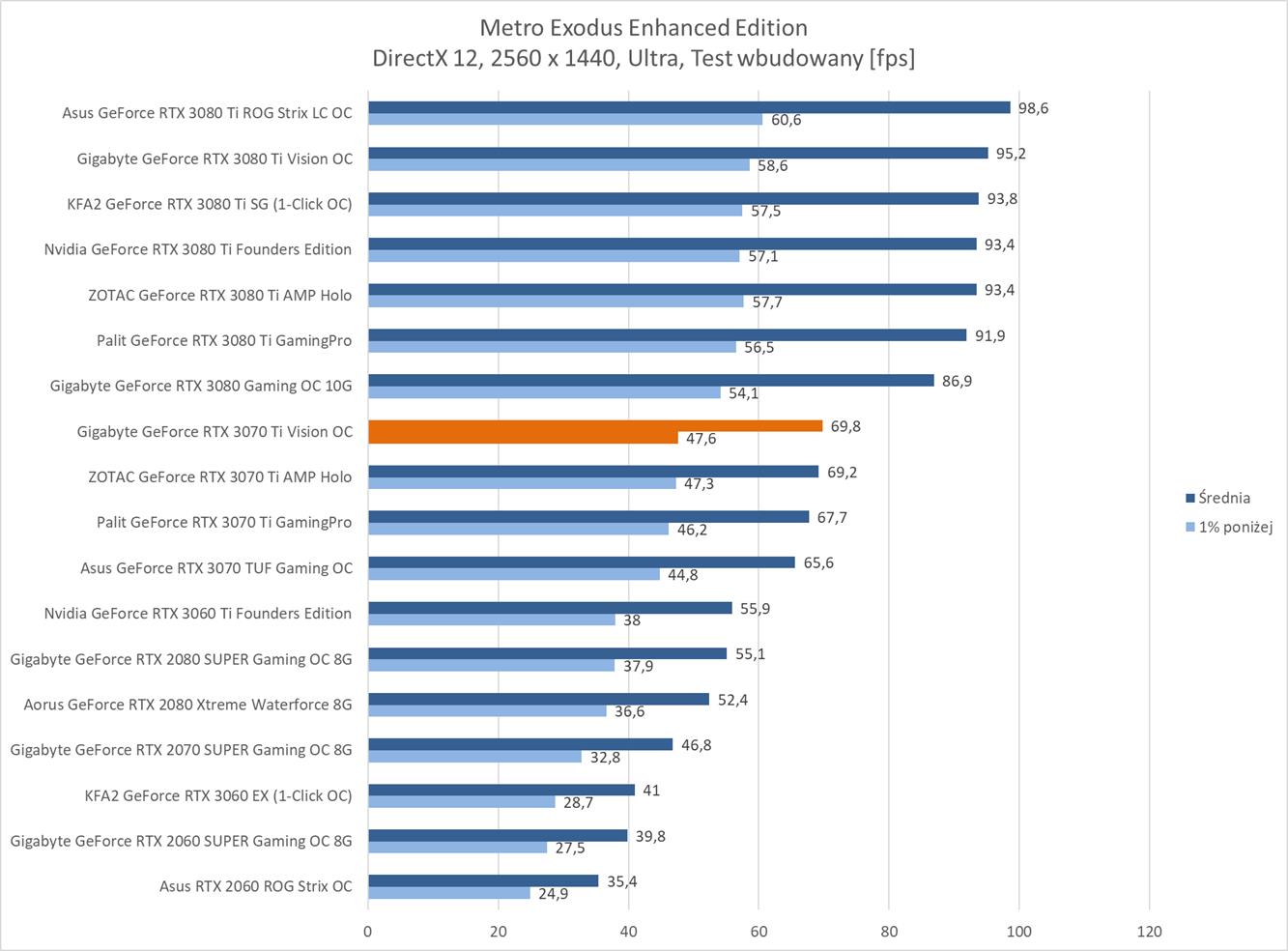 W kolejnej rozdzielczości ponownie Gigabyte GeForce RTX 3070 Ti Vision OC zanotował średnio powyżej 60 fps w każdym tytule. Wyniki są też bardzo podobne do modelu ZOTACa, więc tutaj nie ma żadnego zaskoczenia.