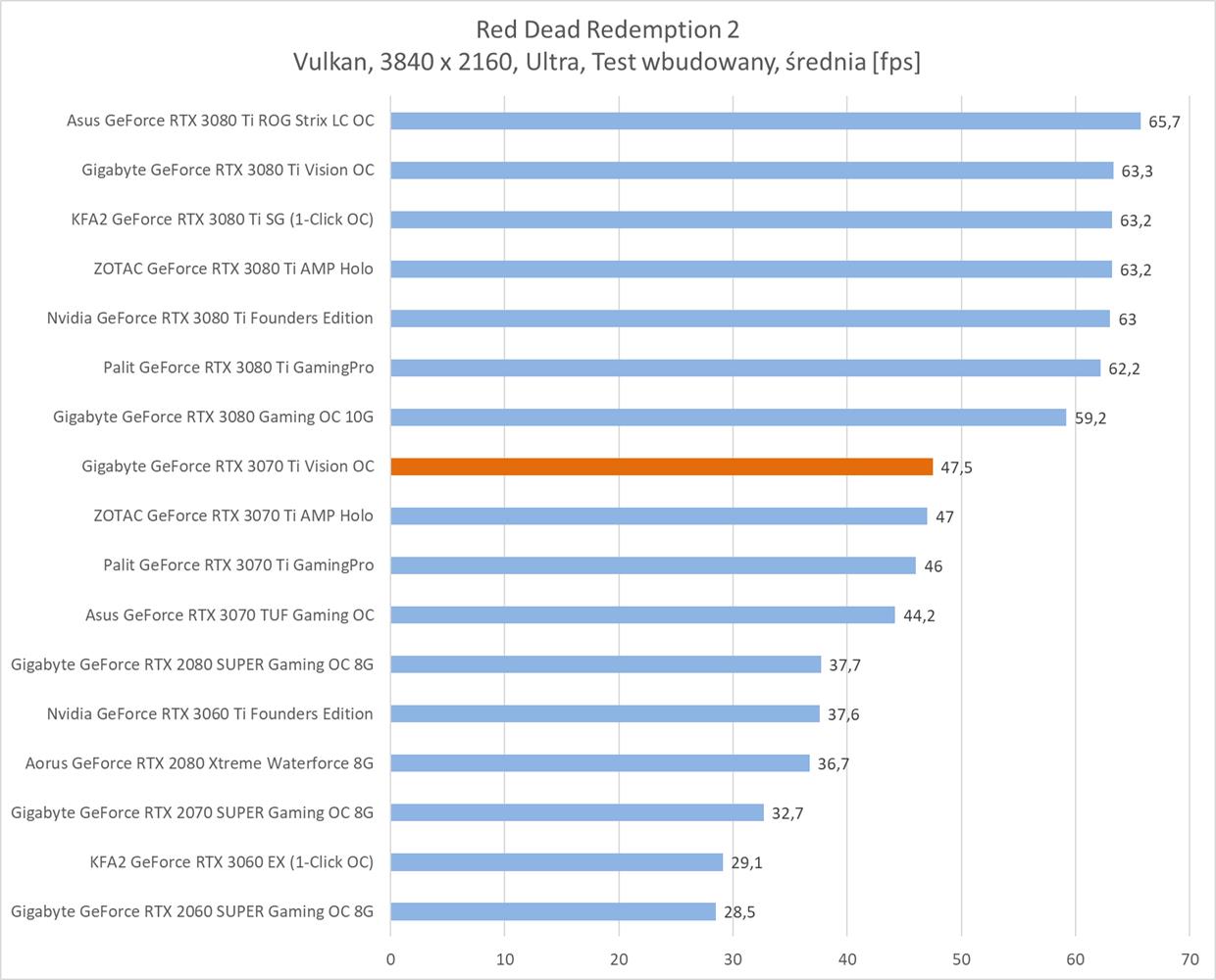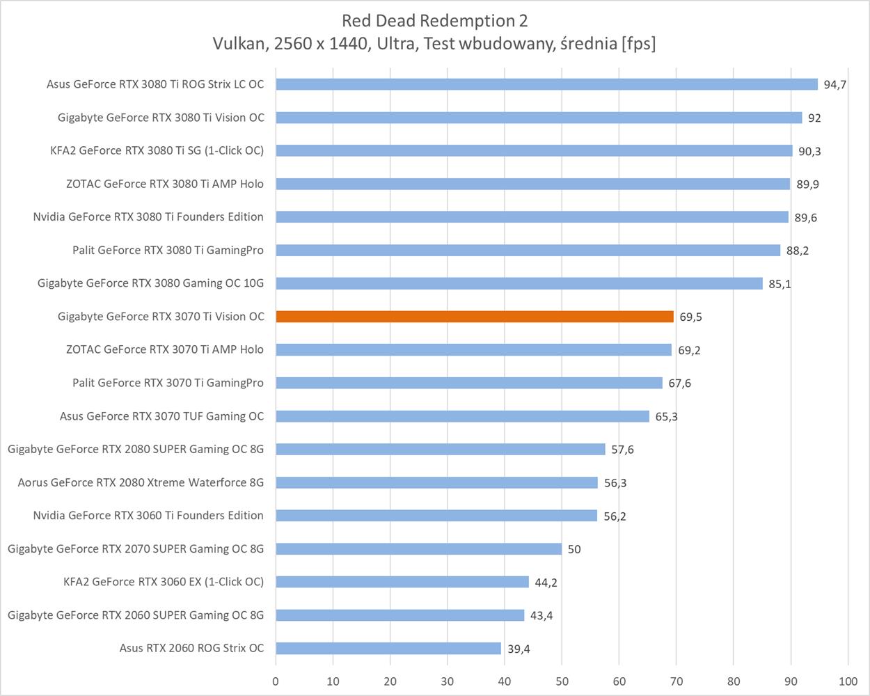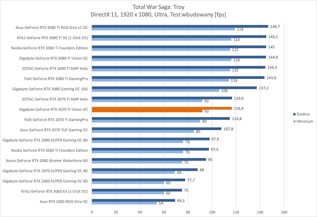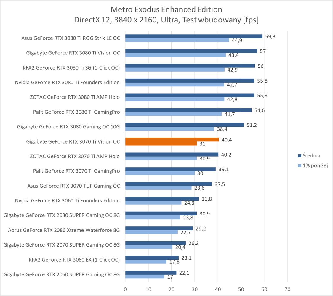 Gigabyte GeForce RTX 3070 Ti Vision OC jest wydajniejszym modelem niż wersja Palita. Wypada on także praktycznie tak samo jak karta ZOTACa – większych różnic tutaj nie ma. Fabryczne OC pozwala więc na zyskanie kilku fps względem niepodkręconych konstrukcji. Ponownie jednak zauważę, że strata do RTX 3080 jest dosyć spora, a sam zysk w stosunku do podkręconego RTX 3070 niezbyt wielki.