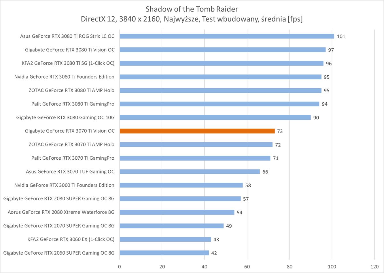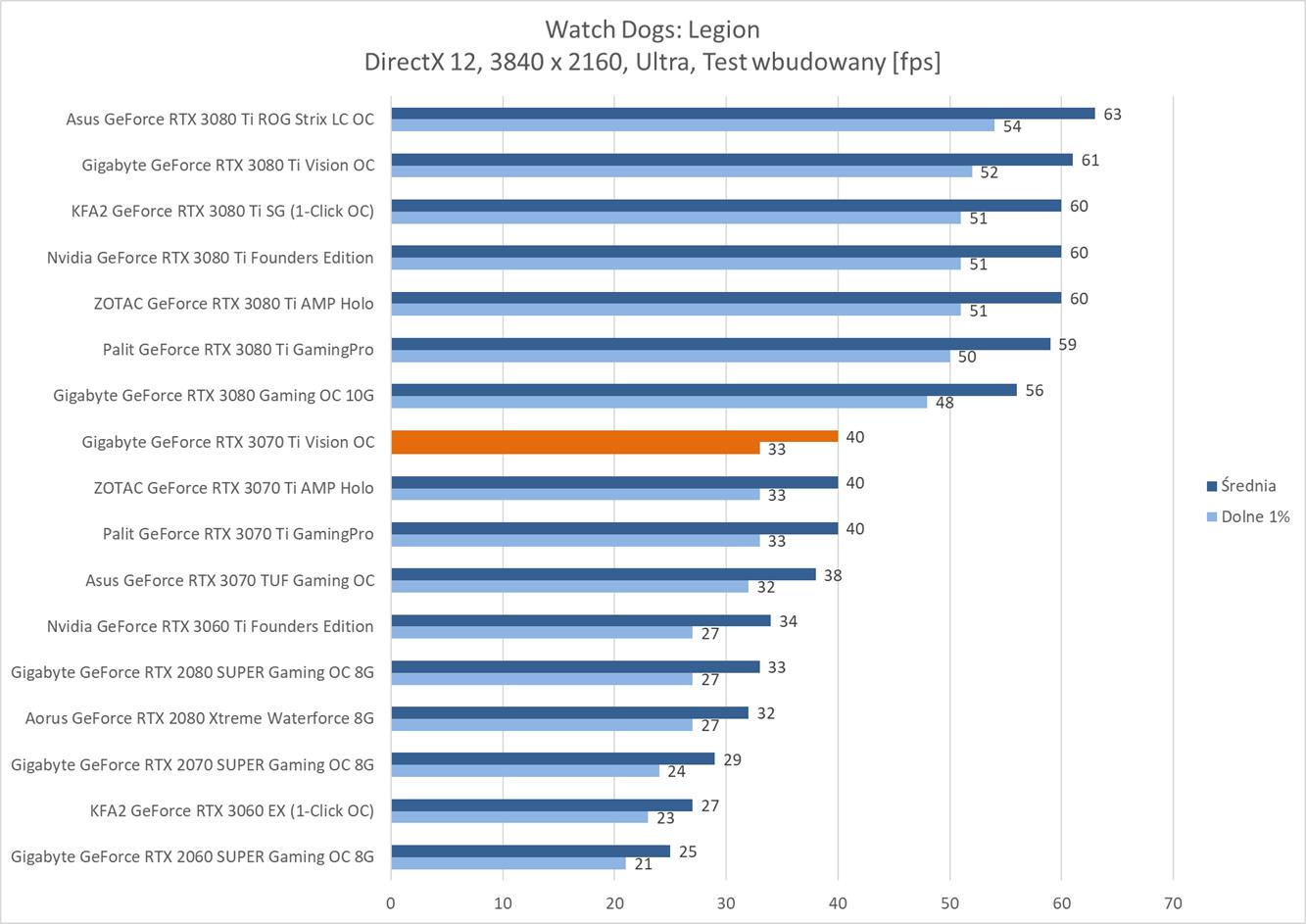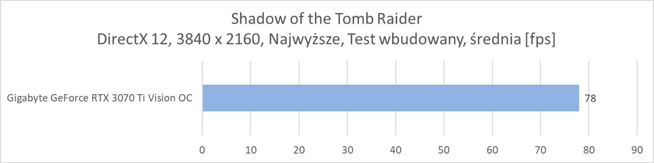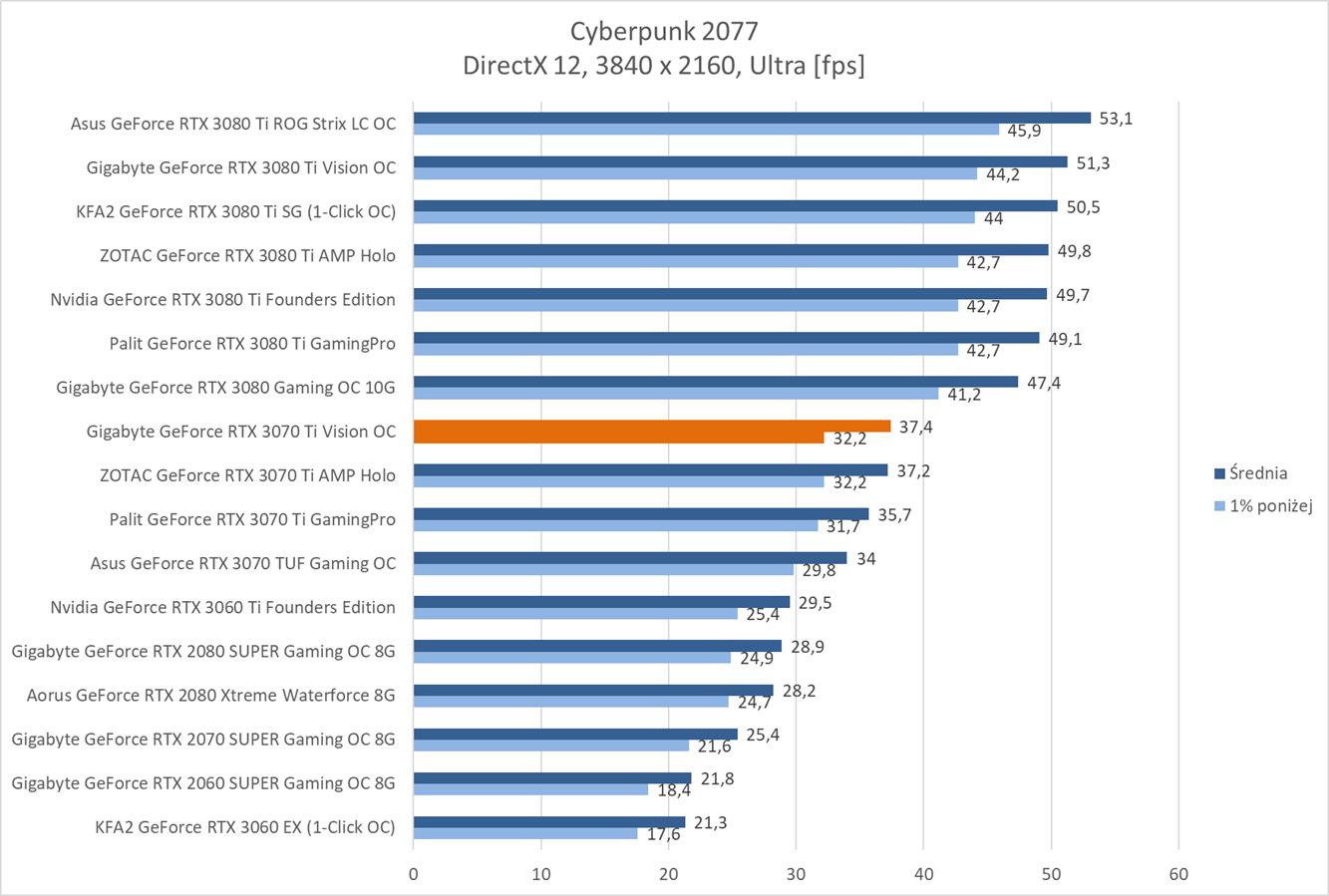 Niestety do rozdzielczości 3840 x 2160 potrzeba już mocniejszej karty albo obniżenia detali. Testowany model jedynie w dwóch tytułach osiągnął średnio powyżej 60 fps. Ponownie też widać, że różnica w stosunku do RTX 3080 jest naprawdę spora.