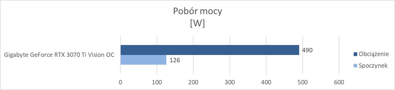 Pobór mocy jest również bez zaskoczenia. 479 W pod obciążeniem to spory wynik, niewiele mniejszy od niektórych modeli RTX 3080 Ti. Nic więc dziwnego, że producent zaleca 750 W zasilacz.