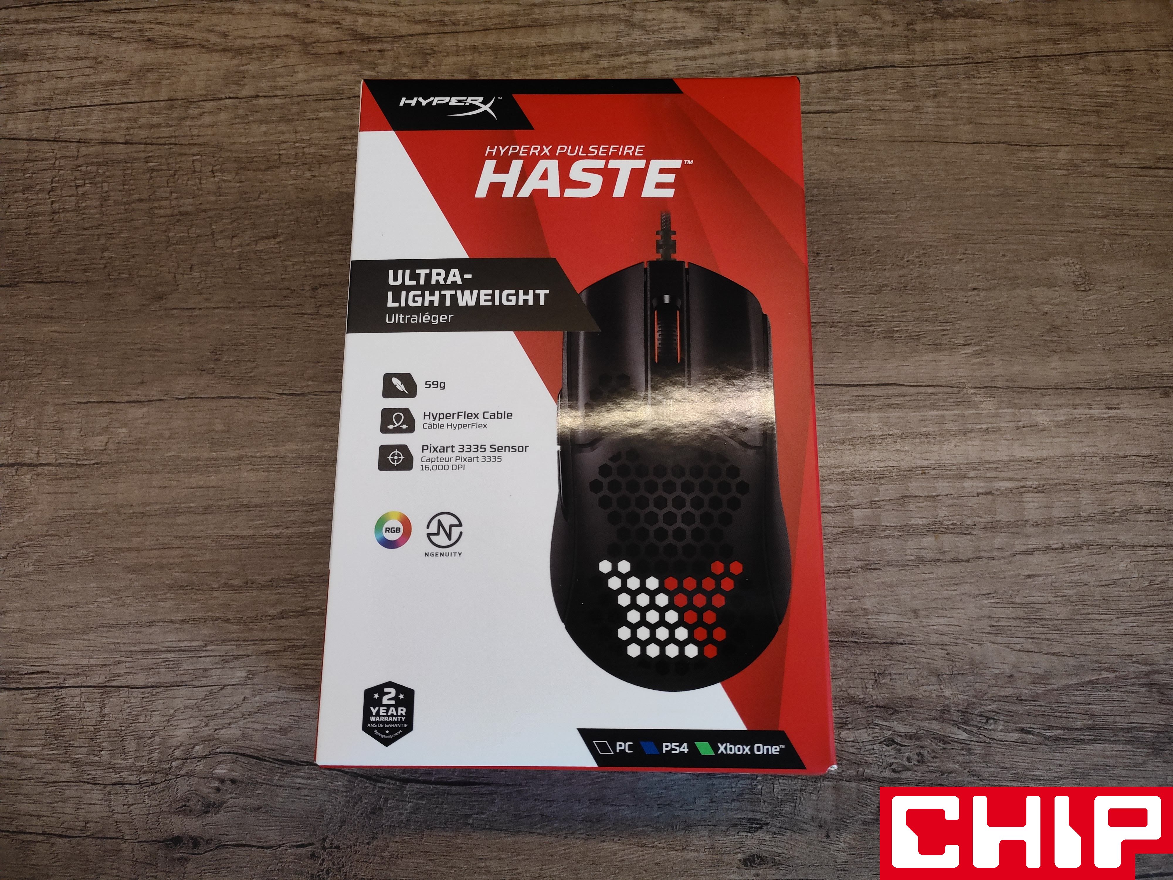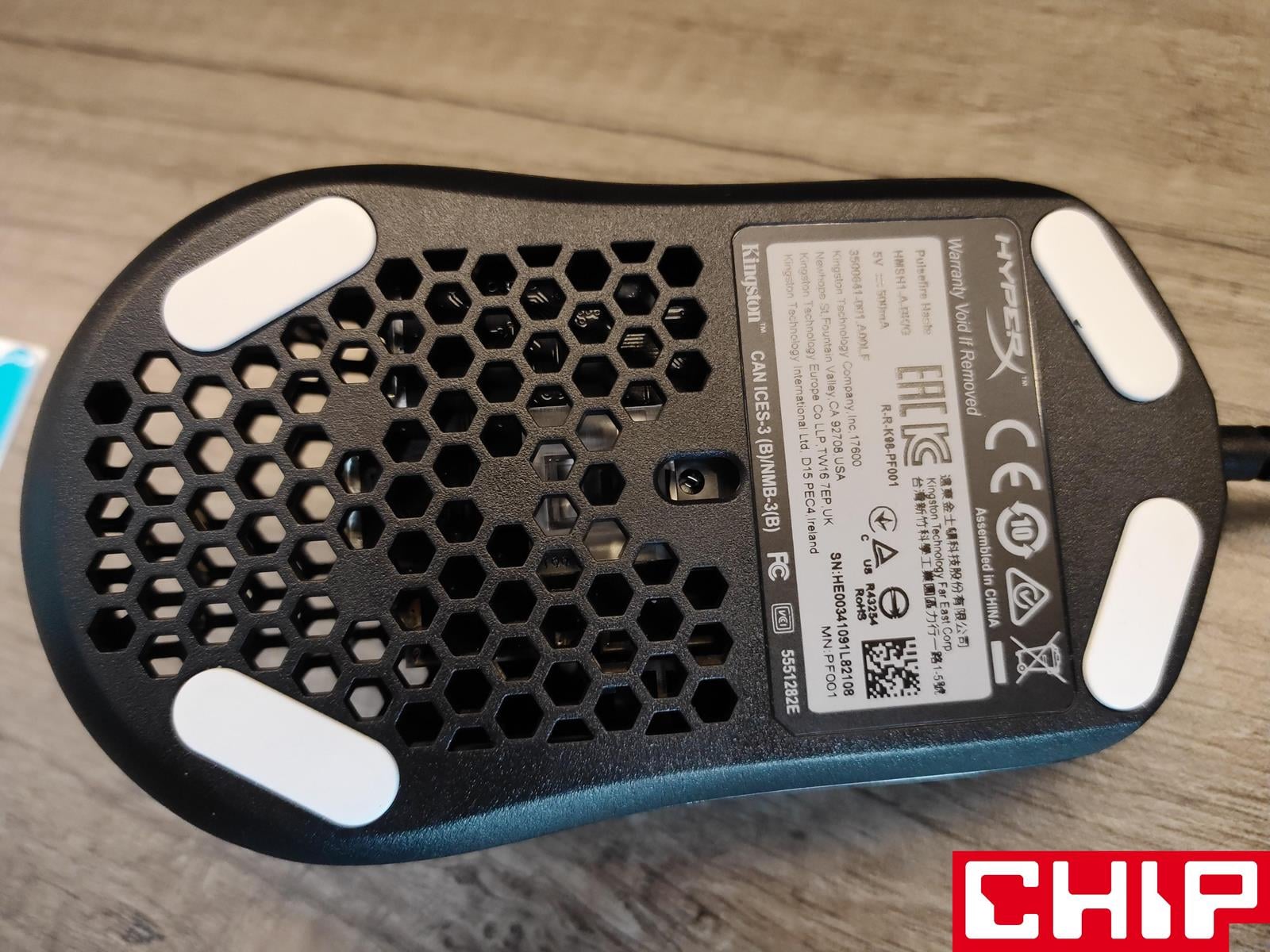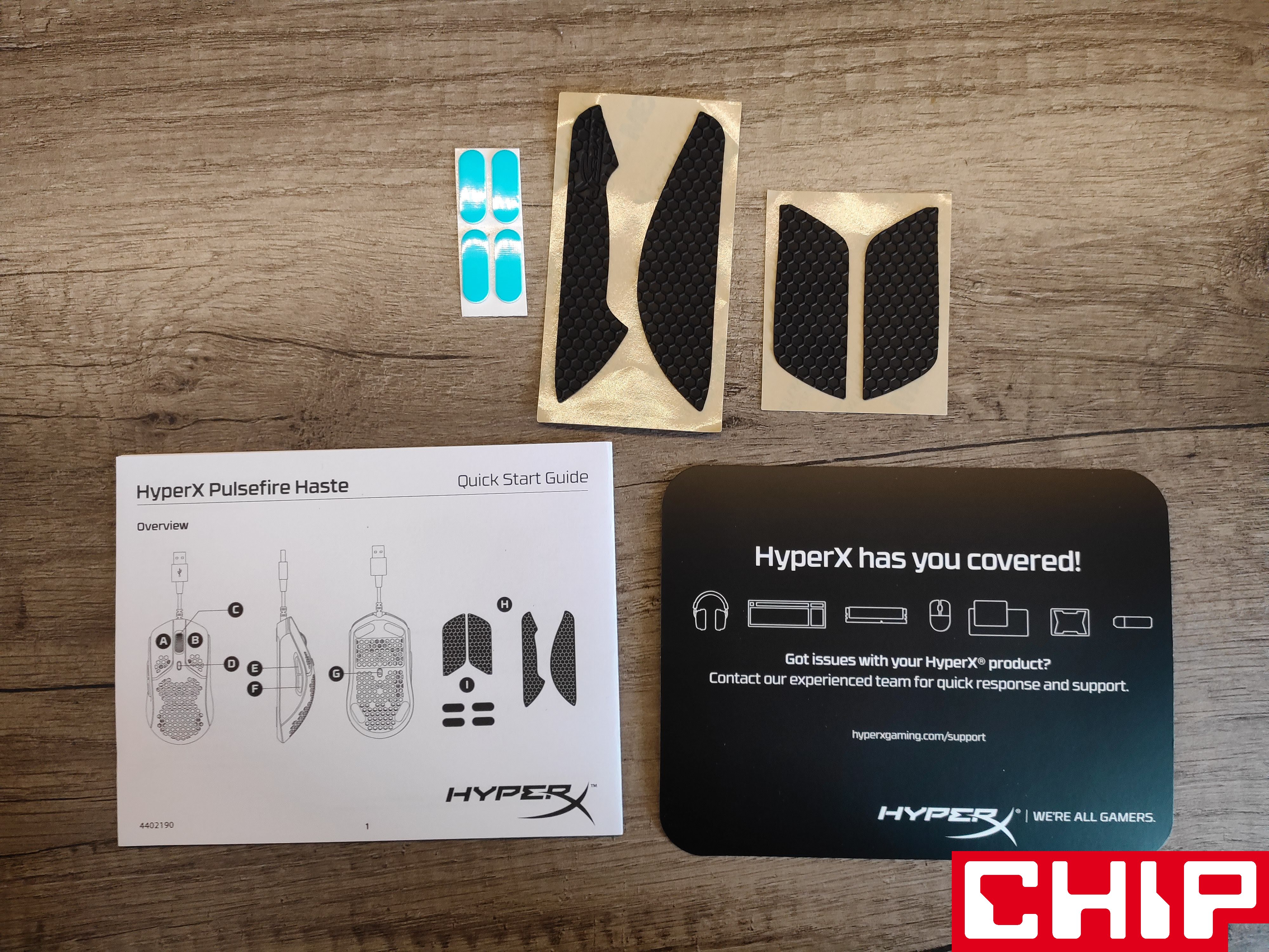 Już na samym pudełku HyperX Pulsefire Haste jasno daje nam znać o swojej podziurawionej naturze. Oprócz myszki producent zadbał o zestaw wymiennych ślizgaczy i dwa zestawy grubych, gumowych nakładek do przylepienia na wcześniej wyczyszczone skrzydełka główne i panele boczne.