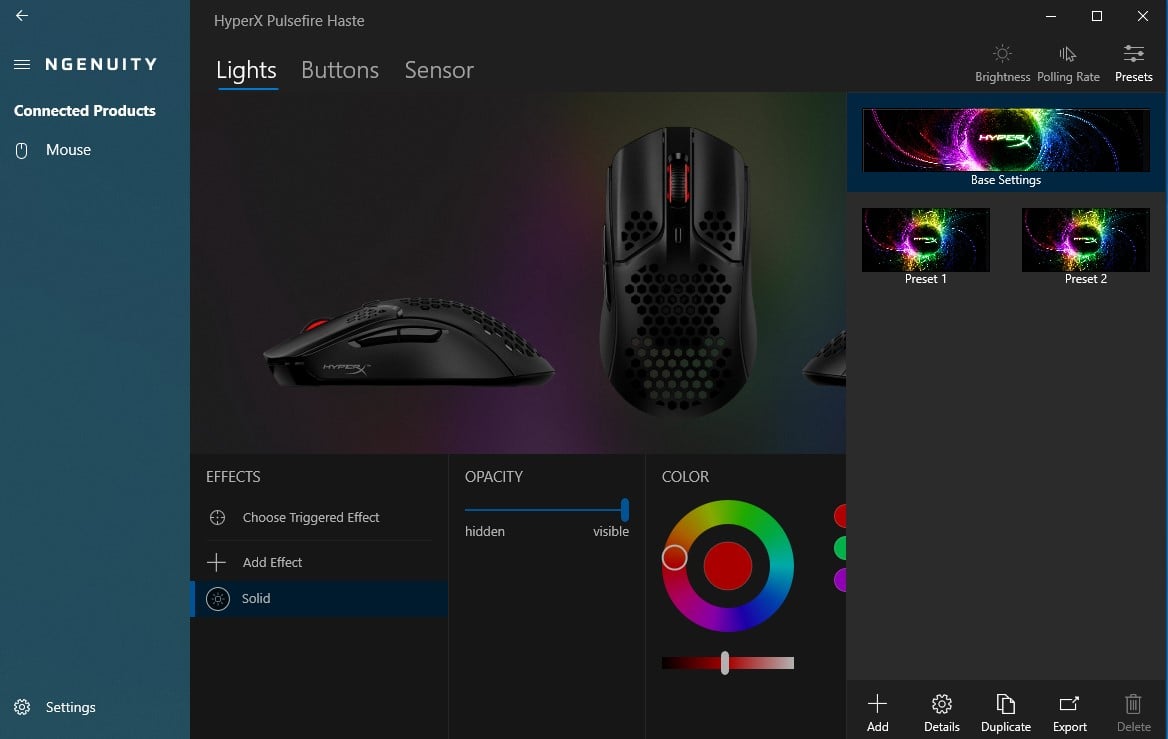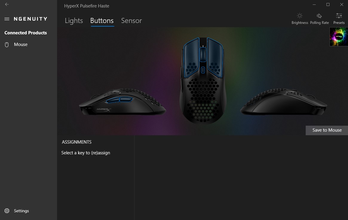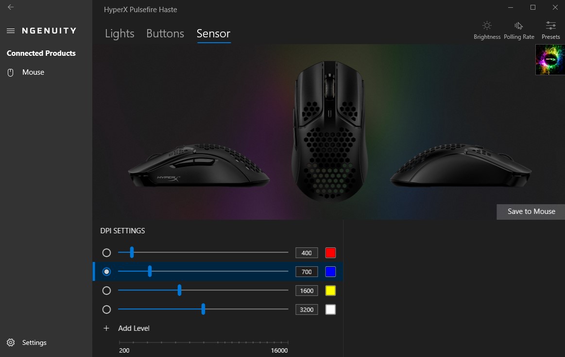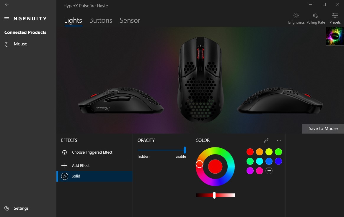 Wchodząc w szczegóły, NGenuity poświęca Pulsefire Haste dokładnie trzy zakładki, które dotyczą podświetlenia RGB z możliwością ustawienia poziomu jasności oraz wybrania kilku efektów z uwzględnieniem ich częstotliwości, nadpisania funkcji przycisków i dostosowania częstotliwości odświeżania sygnału, czy czułości sensora na maksymalnie pięciu poziomach (z przypisanym kolorem, podświetlającym się w chwili zmiany poziomu)