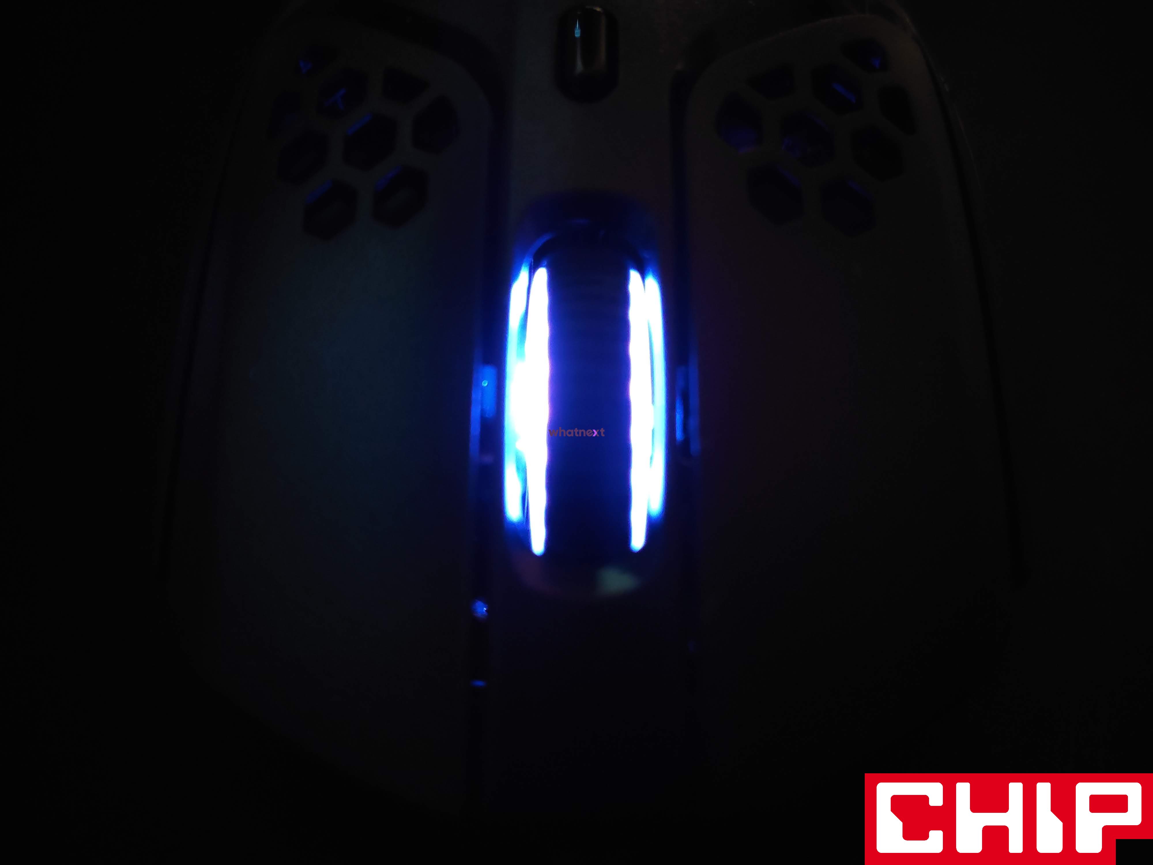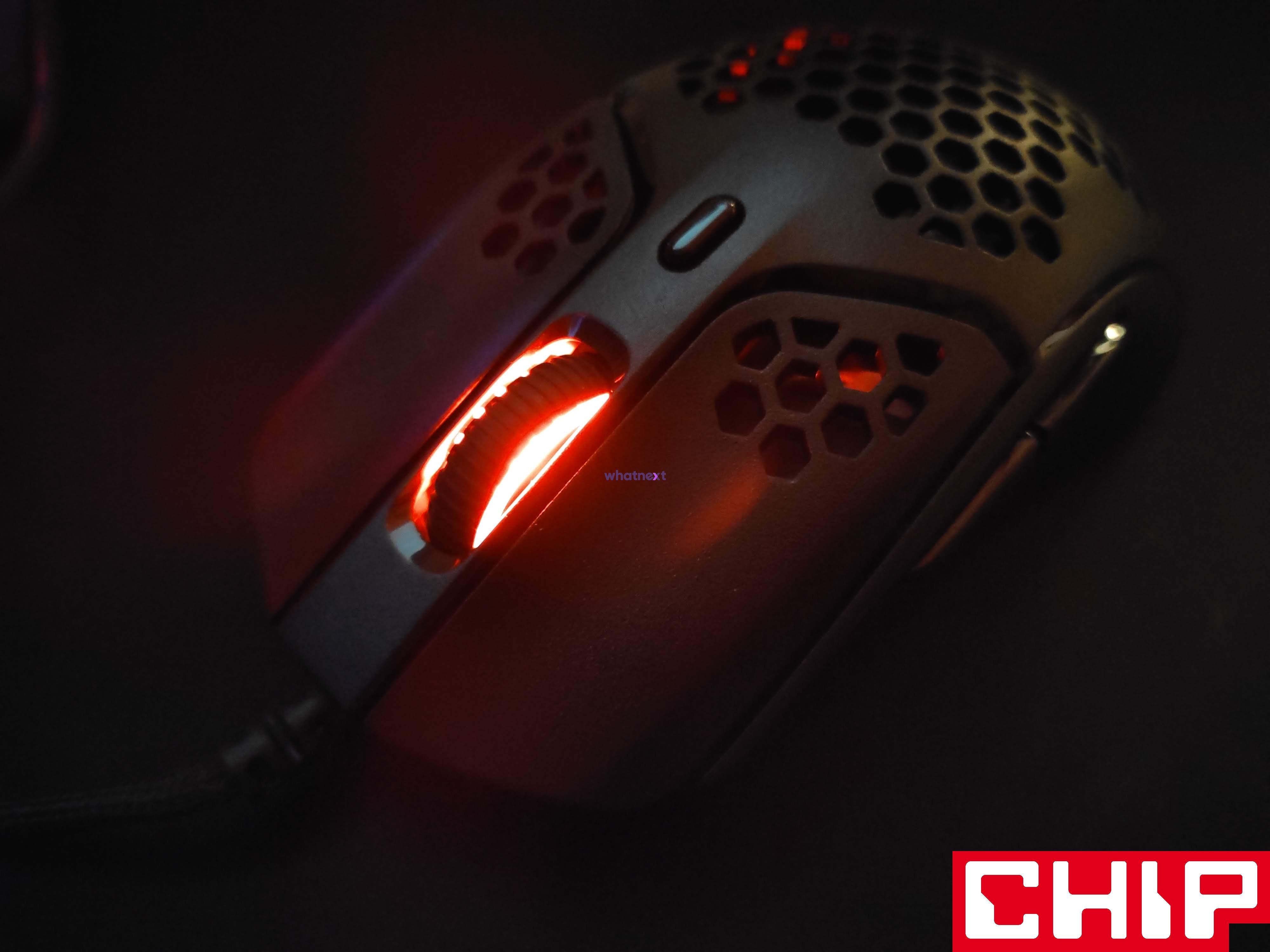 Pulsefire Haste podświetleniem zdecydowanie naszego serca nie podbije, bo sprowadza się tylko do rolki. Ta może przybrać cztery najpopularniejsze efekty (stały, oddychający, cyklu barw, zanikający), pożądany kolor RGB, czy poziom jasności. Rolka może i rozświetla się ładnie, ale trudno nie mieć wrażenia, że ten dodatek diod wrzucono tutaj poniekąd na siłę.