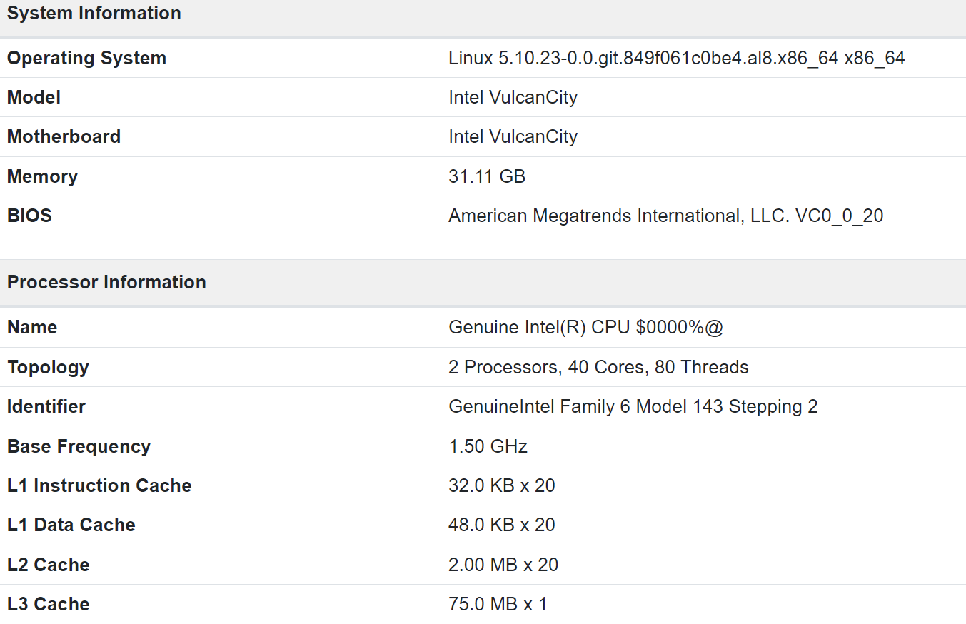 Najważniejsze jest to, że testowany CPU oferuje 20 i 40 wątków, a w tym teście został sprawdzony na referencyjnej platformie firmy Intel o nazwie kodowej VulcanCity, na której znalazł się też drugi procesor. System został wyposażony w 32 GB pamięci (najpewniej DDR5), ale o nieznanej częstotliwości.