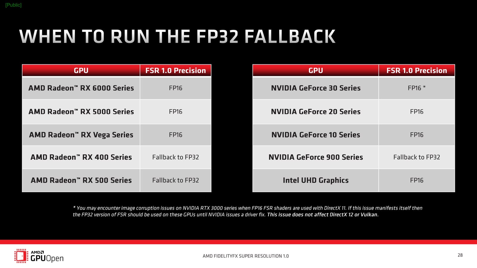 W wersji 1.0 FSR ma ciekawe rozwiązanie awaryjne dla starszych kart graficznych, bo choć normalnie algorytm skalowania jest obliczany na podstawie obliczeń o połowicznej precyzji, to w przypadku serii Radeon RX 500 i RX 400 oraz GeForce 900 włączony jest tryb awaryjny FP32 o pojedynczej precyzji.