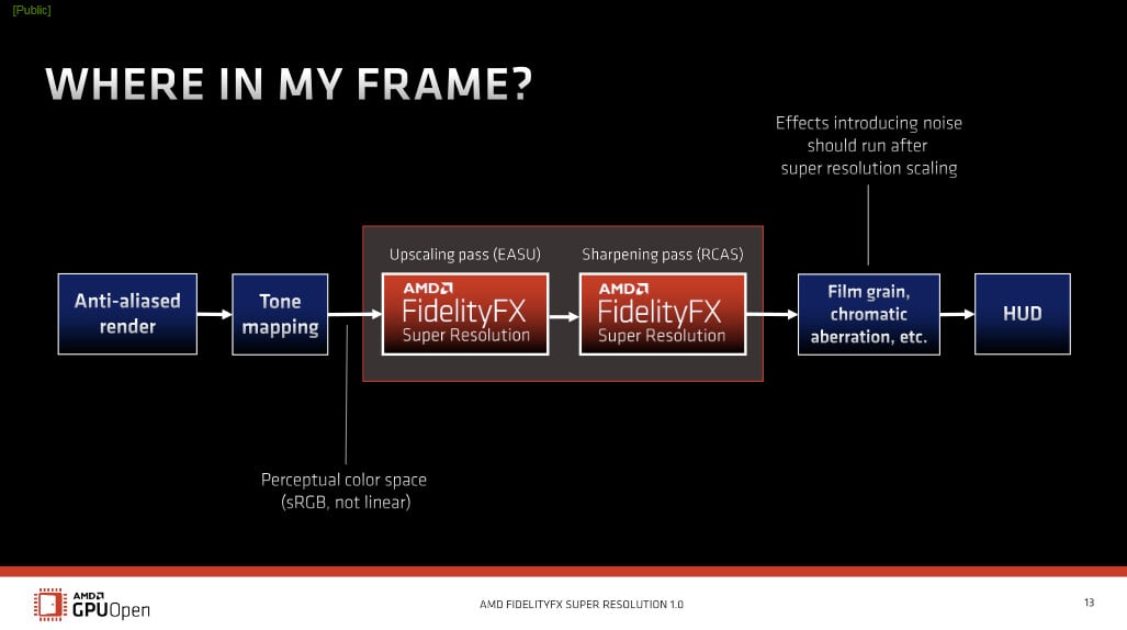 AMD FidelityFX Super Resolution “znajduje się” w środku potoku graficznego renderowania gry. Dokładnie w miejscu, gdzie prawie gotowa klatka w niższej rozdzielczości, która została wyrenderowana, zmapowana i wygładzona, jest przetwarzana przez FSR w dwuprzebiegowym procesie skalowania i wyostrzania. HUD i teksty w grze są z kolei natywnie renderowane w docelowej (wyższej) rozdzielczości.