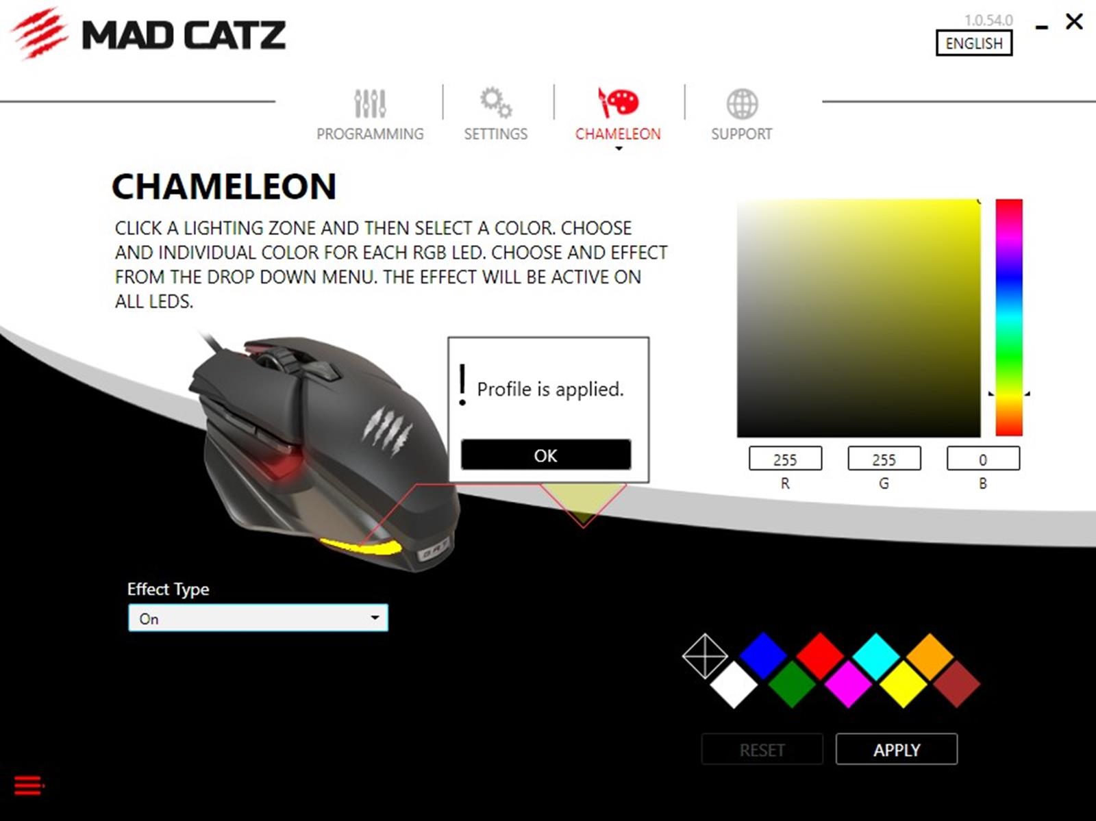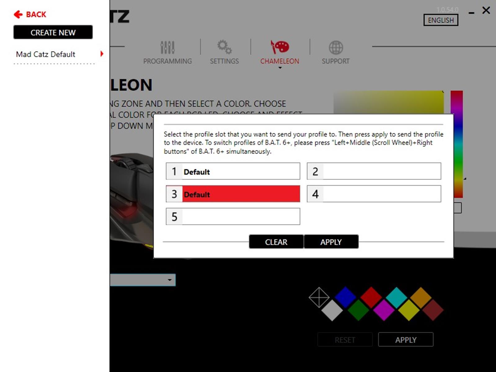 Chociaż system podświetlenia Chameleon brzmi dumnie w przypadku Mad Catz BAT 6+, to nie jest aż tak efektywny. Oferuje tylko tryb stały, oddychania i tęczy z dowolnym kolorem RGB, ale tylko w tym ostatnim zapewnia możliwość dostosowania częstotliwości zmian kolorów oraz jasności diod.