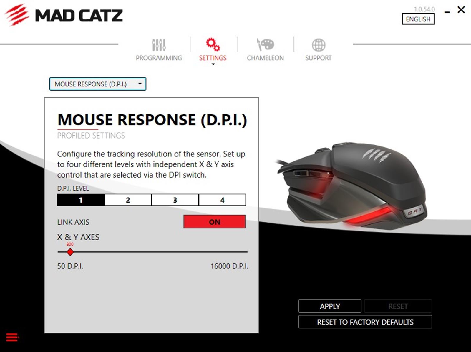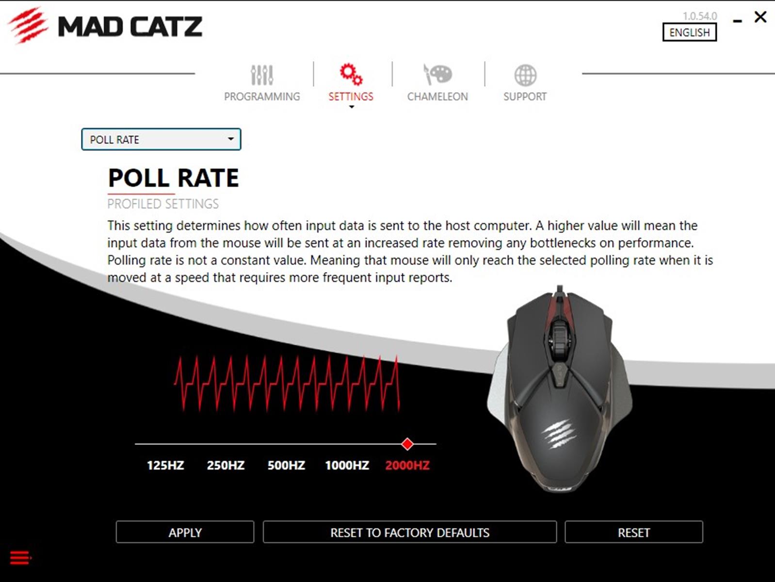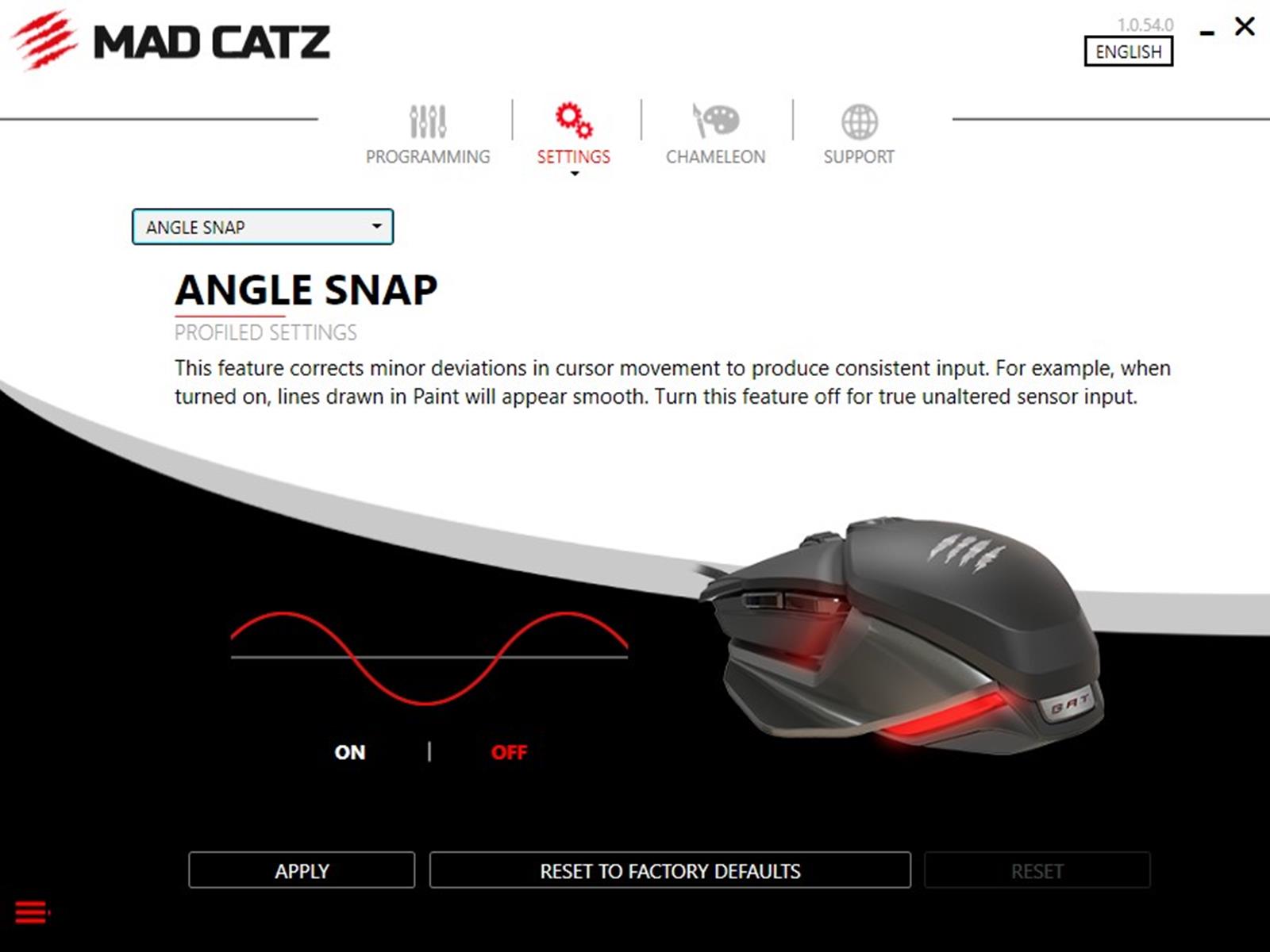 Dostępna do pobrania aplikacja Mad Catz B.A.T. 6+ zdecydowanie wyróżnia się na tle oprogramowania innych producentów. Oferuje zabawę z nadpisywaniem funkcji wszystkich przycisków (w tym przy scrollowaniu w górę lub w dół) z obszernego zbiorku, pozwala dostosować czułość na czterech poziomach od 50 do 16000 DPI, działanie przycisku zmiany DPI, ustawienie odświeżania od 125 do 2000 Hz i aktywację angle snappingu. Nie zabrakło też w opcjach zabawy skromnym podświetleniem Chameleon.