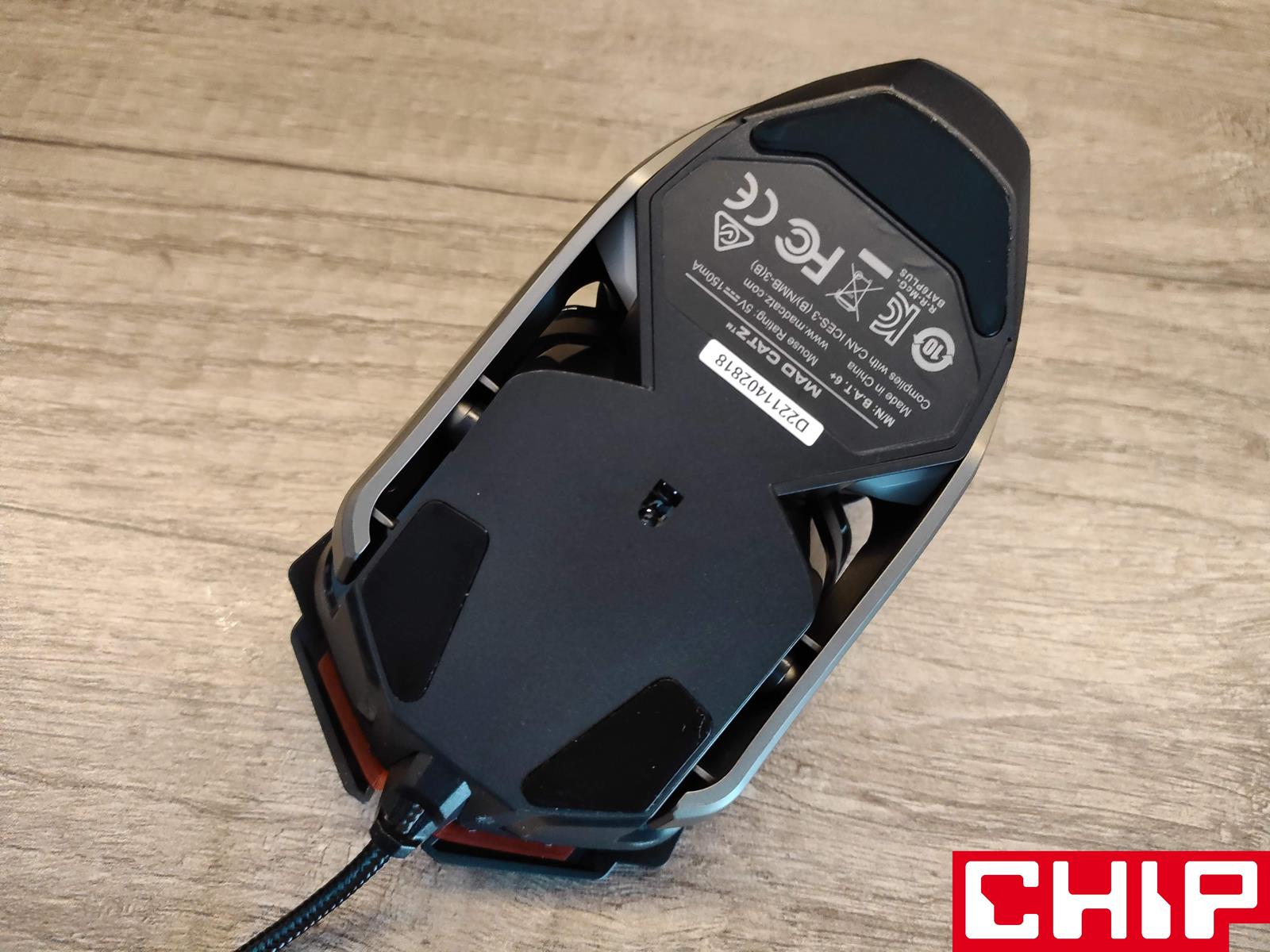 Na spodzie znajdziemy trzy główne ślizgacze o zaokrąglonych krawędziach, skromną lukę na optyczny sensor, podczas gdy z przodu tradycyjnie i delikatnie pod kątem wychodzi wzmocniony oplotem przewód. Lekki, choć bardzo sztywny. Funkcjonalność Mad Catz BAT 6+ dodatkowo rozbudowuje dodatkowa para przycisków na prawym panelu bocznym.