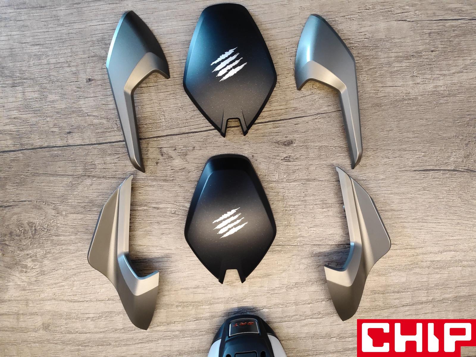 Chociaż zawsze do wymiennych paneli podchodzę z przymrużeniem oka, to w przypadku Mad Catz BAT 6+ spodobały mi się bardzo wyczuwalne różnice między grzbietami i możliwość dowolnego łączenia poszczególnych elementów. Panele boczne różnią się między sobą nie tylko pod kątem obecności “półeczki”, ale też w pewnym stopniu konstrukcją, choć to grzbiet gra tutaj największą rolę.