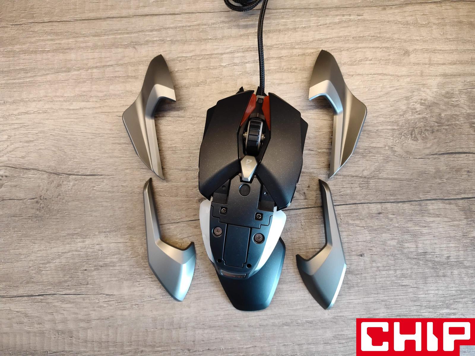 Jednak bez względu na konfiguracje, myszka BAT 6+ ewidentnie pokazuje swój nietypowy pazur, na który składa się ogólne skomplikowanie nietypowej, bardzo geometrycznej obudowy. Wizualne oddzielenie od siebie głównych przycisków, grzbietu i paneli bocznych jest ciekawym, ale w moich oczach przesadnym zabiegiem, którego uzupełniają wizualne dodatki pokroju bordowego wykończenia boków skrzydełek, czy nazwy modelu napisanej wielkimi literami tuż pod grzbietem.