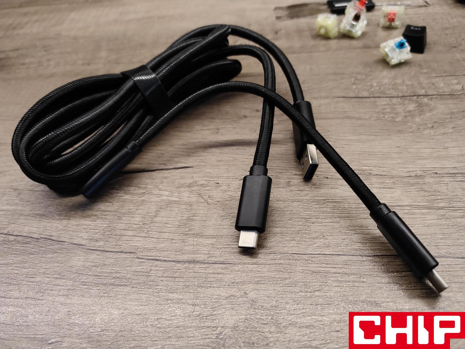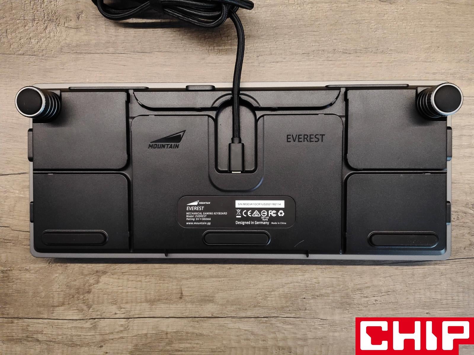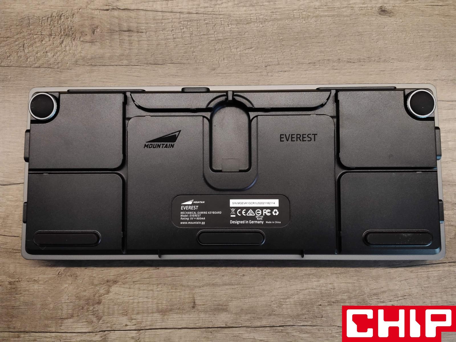 Everest Max może się też pochwalić portem USB-A 3.2 gen. 1 w formie HUBu na tylnej krawędzi, odpinanego grubego przewodu o długości 200 cm w materiałowym oplocie (możliwość rozszerzenia o 15 cm adapterem USB-C do USB-C) i rozległymi kanalikami do odprowadzenia przewodu z każdej strony klawiatury. Ciekawie rozwiązano też ustawianie klawiatury pod odpowiednim kątem, bo cały proces sprowadza się do dostawiania kolejnych magnetycznych modułów na tyle zależnie od preferencji. Niestety, jako że jest ich tylko sześć, nie mogłem zapewnić sobie idealnego pod siebie kąta, chcąc za wszelką cenę utrzymać numepada na biurku, który również posiada dwa te same systemy, jak sama klawiatura. Nie zabrakło też łącznie pięciu wielkich podkładek antypoślizgowych.