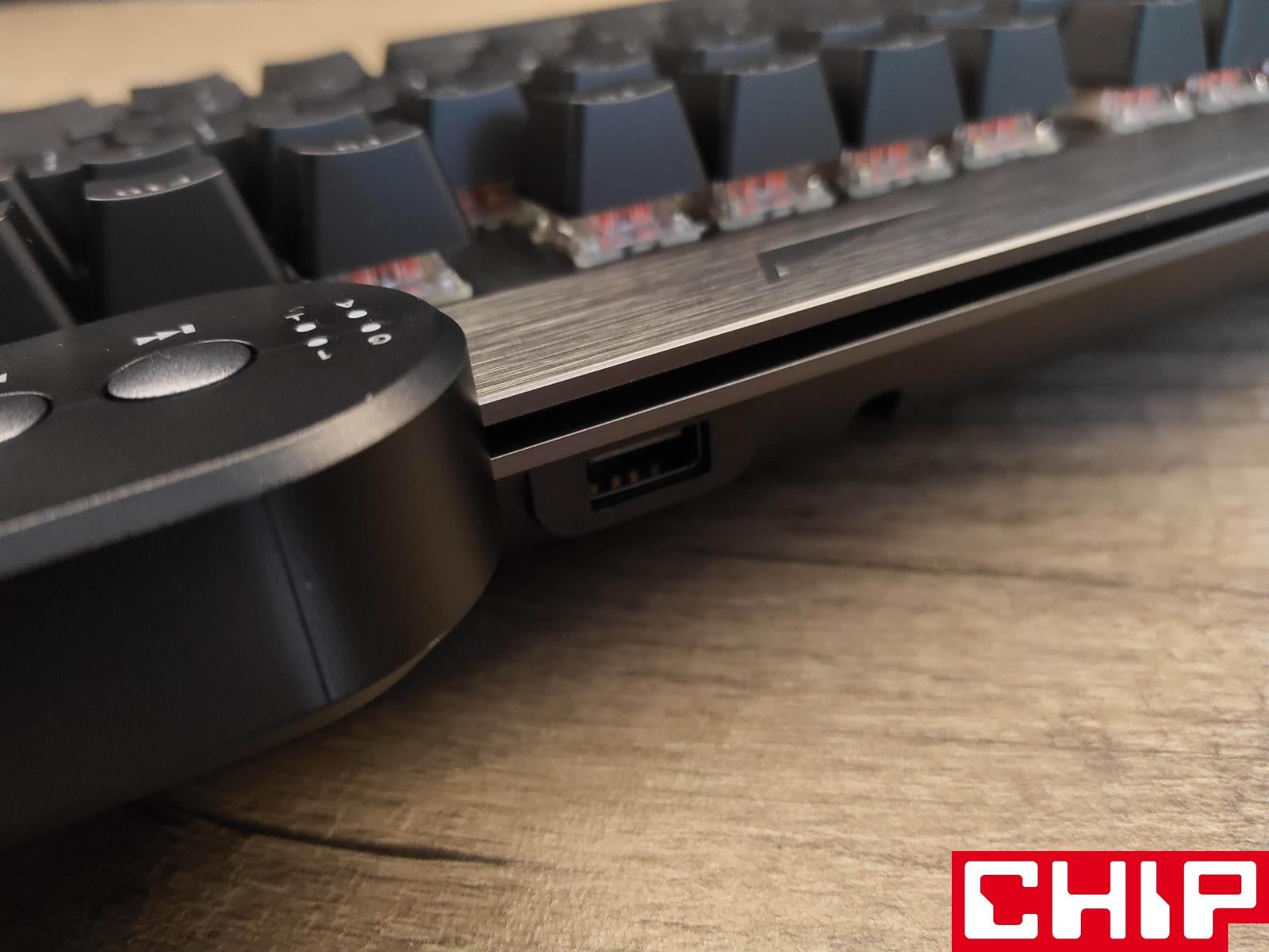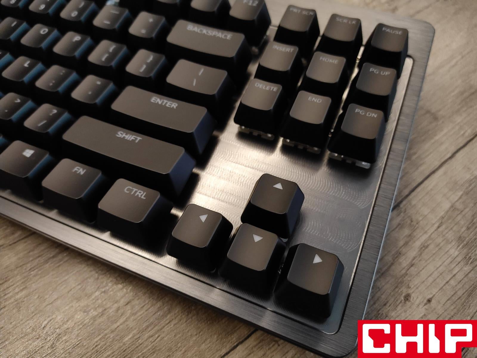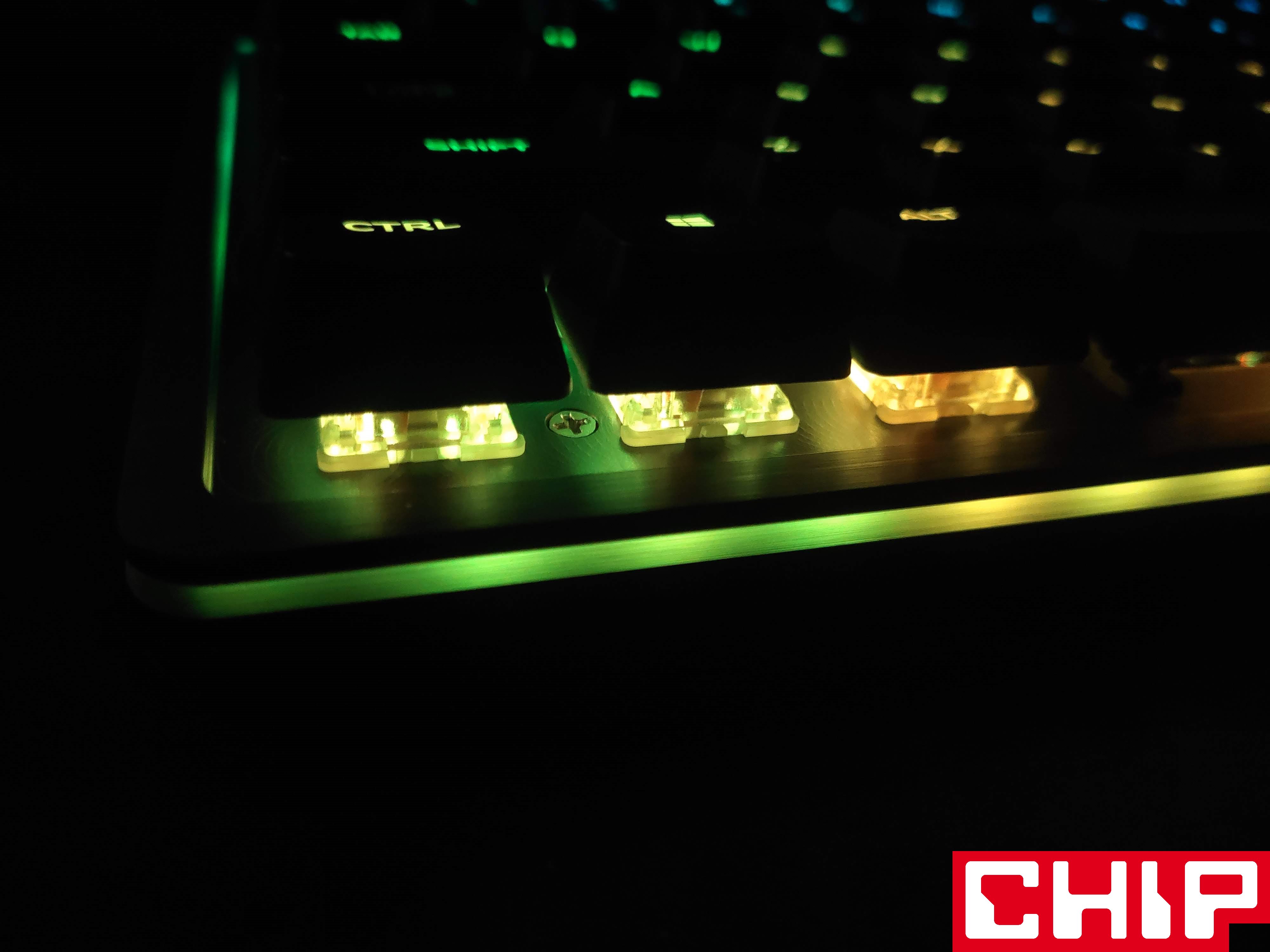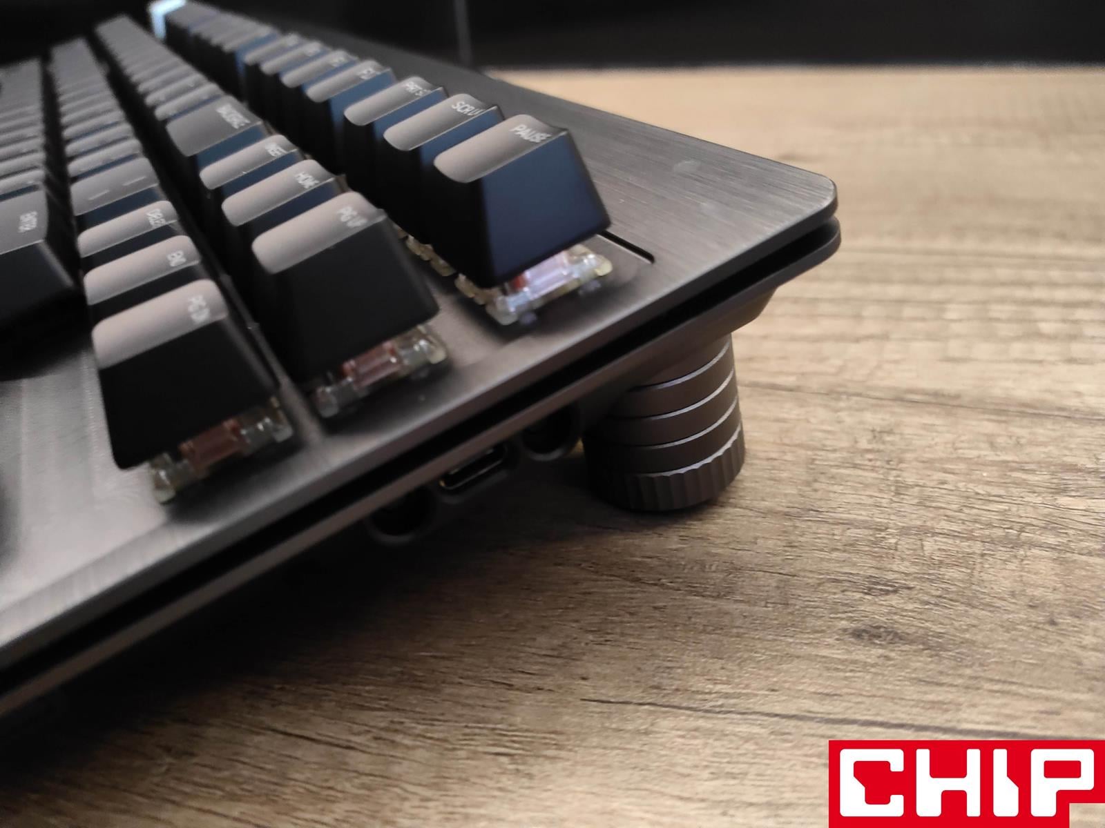 Szanse na zrobienie z tego modelu klawiatury na lata podkreśla również świetnie prezentujący się metalowy panel górny utrzymany w ciemnej szarości, który przyjmuje formę szczotkowanej faktury na krawędziach i znacznie ciekawszej radialnej wokół przełączników. W dłuższym czasie eksploatacji jednym z największych problemów co do długowieczności mogą okazać się dodatkowe wsporniki na dłuższych przyciskach (spacji, enterze, shifcie, czy capslocku), które stabilizują je poprzez wysuwane trzonka odpowiadającego “krzyżakom” samego przełącznika. Są one bowiem po prostu przesmarowane, a użyty w tym celu specyfik może stracić swoje właściwości.