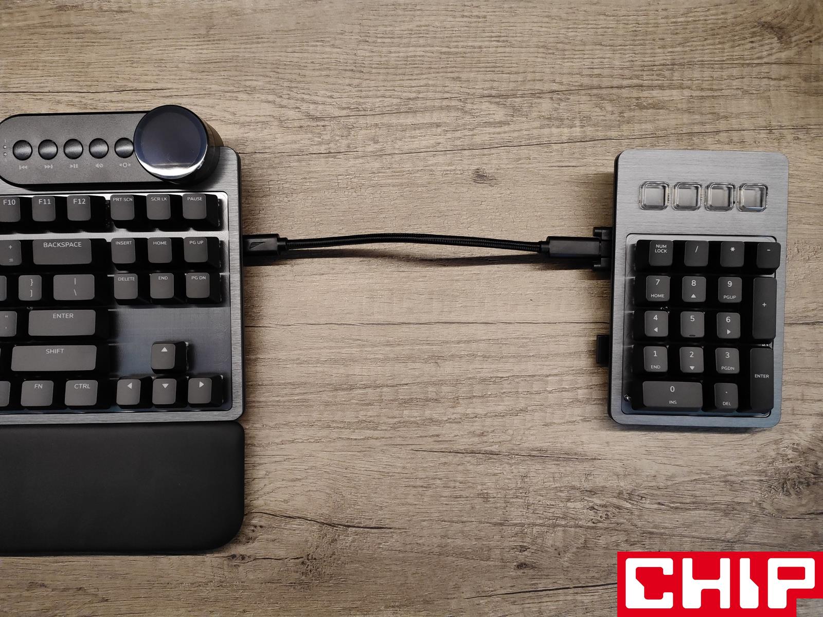 Pragniecie jeszcze szerszych możliwości? To również w Mountain Everest Max znajdziecie. Możecie zdecydować się na numepada po lewej, lub prawej stronie, postąpić podobnie z podobną dostawką z myślą o funkcjach multimedialnych na górnej krawędzi albo oba te dodatki na raz. Gdyby tego było mało, możecie skorzystać z 15-centymetrowego adaptera USB-C do C i podpiąć za jego pośrednictwem numepada do jednego z tych dwóch przeznaczonych dla niego złączy na lewym i prawym boku klawiatury, zapewniając sobie coś w rodzaju oddzielonego od reszty bloku.