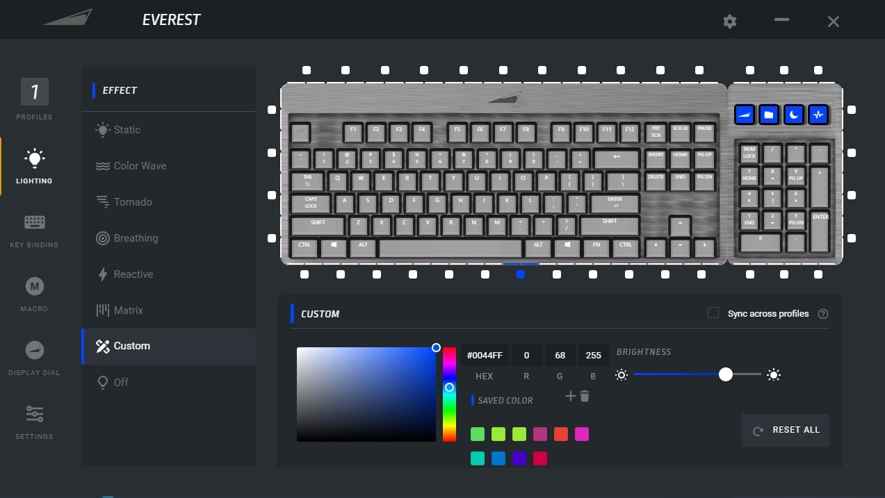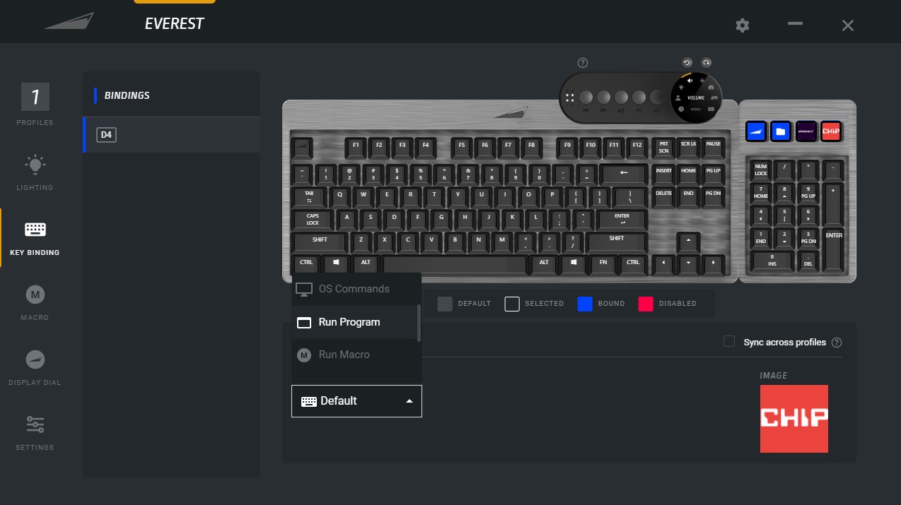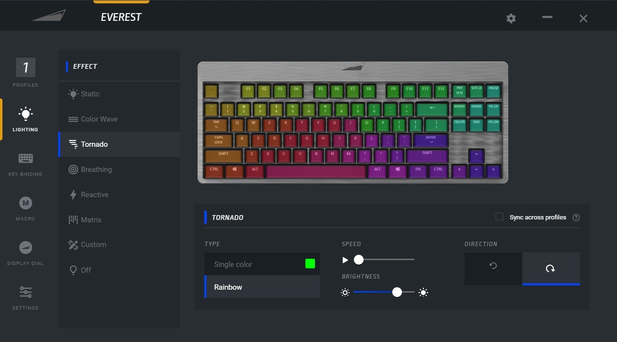 Poza tym Base Camp pozwala nam tworzyć i podpinać profile do konkretnych aplikacji, robić to samo z klawiszami z naciskiem na te z wyświetlaczami, tworzyć zaawansowane makra, dostosowywać wyświetlacz na pokrętle i tryb gamingowy. Oczywiście możemy też bawić się podświetleniem w myśl zaprojektowanych wcześniej 7 profili z ósmym, odpowiadającym za kompletną dezaktywację podświetlenia. Wpływamy w opcjach nie tylko na kolor, ale też szybkość i kierunek efektu, jeśli to go obejmuje.