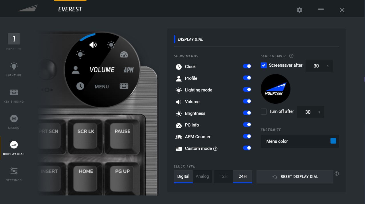 Jak tu nie docenić okrągłego wyświetlacza TFT IPS na pokrętle głośności (240 x 204 px), który razem z pokrętłem i przyciskiem obok stanowi istne centrum dowodzenia Mountain Everest Max? Zwłaszcza że poza opcją dostosowywania podświetlania, poziomu głośności, jasności diod, czy wybieraniem profilu, ten ciekawy dodatek pozwala nam też wyświetlać zegar z aktualną datą, odliczać czas na stoperze, podglądać liczbę akcji dokonywanych na klawiaturze na minutę, czy zużycie komponentów PC (w moim przypadku odczyt CPU i HDD nie działał)?
