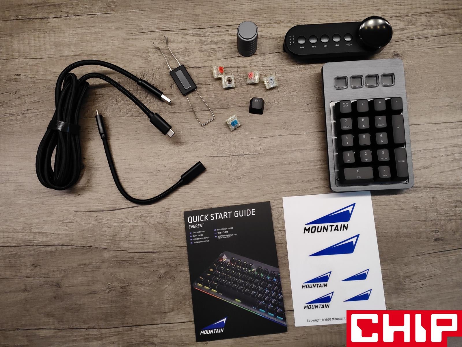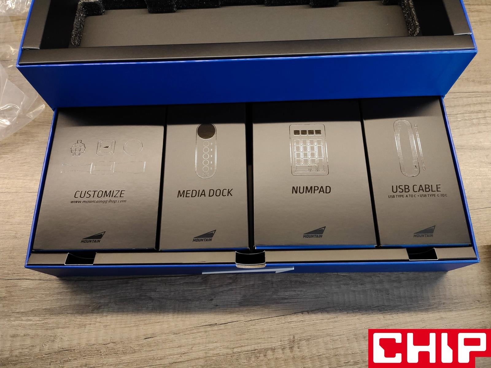 W istnej szufladzie znajdziemy pięć kolejnych pudełek, które skrywają odpinanego numepada, przewód z adapterem, medialny moduł, instrukcję obsługi i kilka naklejek oraz być może jeden z najlepszych zestawów akcesoriów na rynku klawiatur mechanicznych. Obejmuje on bowiem zastępczy keycap ESC, ściągacz do przełączników, pięć odmiennych, wymiennych przełączników Cherry MX i osiem magnetycznych nakładek, będących w Everest Max alternatywą dla nóżek zwiększających nachylenie klawiatury.