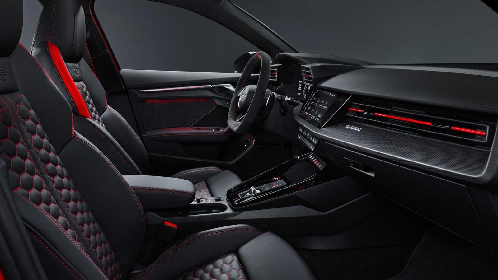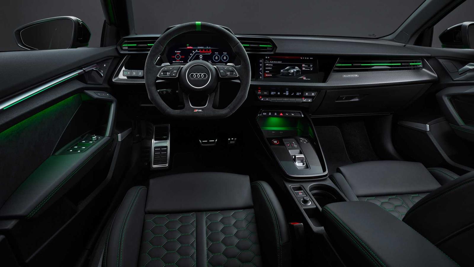Wewnątrz Audi RS3 2022 łączy zestaw wskaźników Audi Virtual Cockpit o przekątnej 12,3 cala i 10,1-calowy wyświetlacz informacyjno-rozrywkowy z systemem MIB3. Sportowe ulepszenia obejmują dostępny opcjonalnie wyświetlacz HUD, standardowe wykończenie z włókna węglowego i tryby RS Runway. Wyposażenie dopełniają pikowane siedzenia o strukturze plastra miodu z podpisem RS z kontrastowymi czerwonymi, czarnymi lub zielonymi przeszyciami. Opcjonalnie można też dopieścić kabinę jeszcze większą ilością czerwonych lub zielonych akcentów na rogach siedzeń, desce rozdzielczej i panelach drzwi.