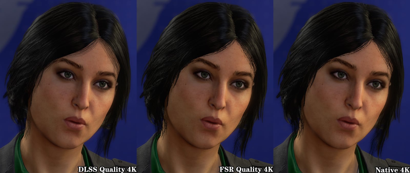 Podobny problem wystąpił również w 4K przy tym samym ustawieniu, gdzie DLSS nie tylko pokonał FSR (patrz włosy na czole), ale też poradził sobie z grafiką lepiej od zwyczajnego renderowania bez użycia żadnej z technologii. Trudno jednak na odpowiednik od AMD narzekać, bo NVIDIA dopracowuje już swoje rozwiązanie od ponad trzech lat (stąd wersja 2.2) i też miała swojego czasu problemy z tymi szczegółami, podczas gdy AMD oferuje na ten moment FSR w tej pierwszej, niesprawdzonej szeroko wersji.