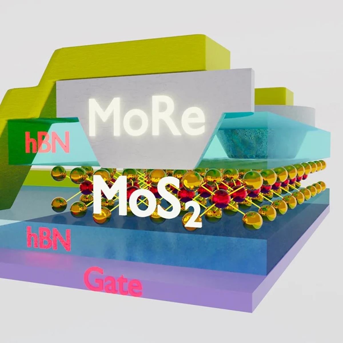 Naukowcy (opracowanie dostępne w Nano Letters) połączyli ze sobą półprzewodnik w postaci MoS2, czyli dwusiarczku molibdenu z MoRe, czyli molibdenem-renem o właściwościach nadprzewodzących. Poniżej możecie zobaczyć, jak wygląda owoc tej synergii, z którego obserwacji naukowcy oczekują odkrycia zupełnie nowych zjawisk przepływu elektronów.