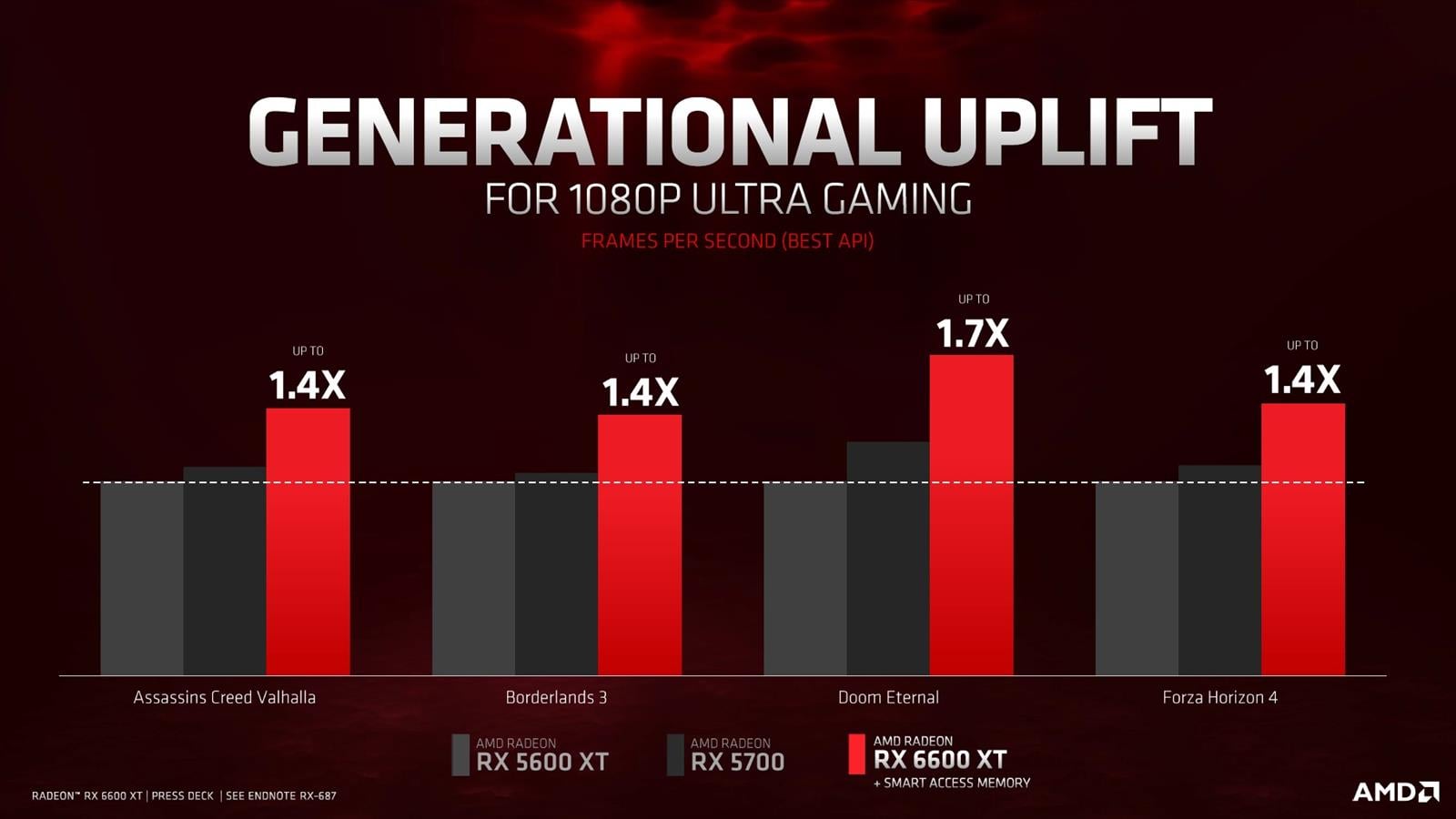 Na tym wykresie możecie z kolei podejrzeć to, jak Radeon RX 6600 XT wypada na tle poprzedniej generacji kart pod kątem liczby klatek na sekundę. Nie tylko swojego odpowiednika (RX 5600 XT), ale też wydajniejszego RX 5700. Oczywiście wszystko zależy od gry, ale trzeba przyznać, że aż 70% wzrost wydajności w Doom Eternal robi wrażenie.