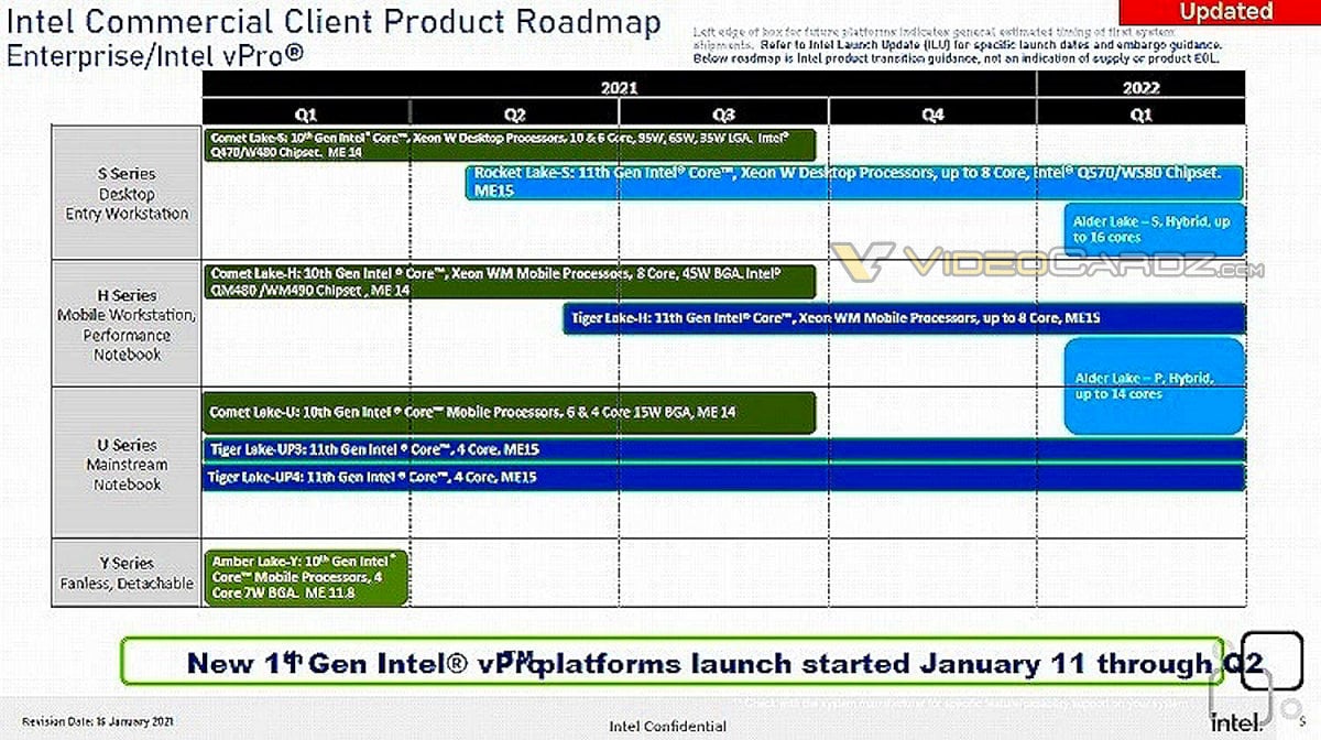 Serwis Videocardz położył swoje łapki na nieoficjalnych planach Intela, wedle to których firma zamierza odświeżyć rodzinę procesorów vPro w pierwszym kwartale przyszłego roku. Chociaż ta roadmapa ma na karku sporo, co sugeruje, że nie powinniśmy wierzyć jej aż w takim stopniu, to 16 stycznia 2021 roku nie wydaje się aż tak odległym dniem. Oczywiście ponad pół roku, to szmat czasu na zmiany planów, ale na ten moment nie pozostaje nam nic innego, jak uwierzyć.