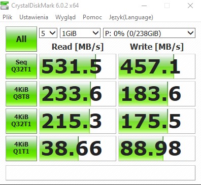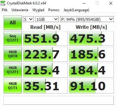 W testach okazało się, że wydajność dysku A55 w wersji 1024 i 512-gigabajtowej jest praktycznie identyczna. Nic w tym dziwnego, jako że oba dyski posiadają bliźniacze wyposażenie i tę samą liczbę układów. Inaczej jest jednak z wariantem 256 GB, który jest reklamowany, jako mniej wydajny, a na dodatek posiada mniej renomowane komponenty składowe.