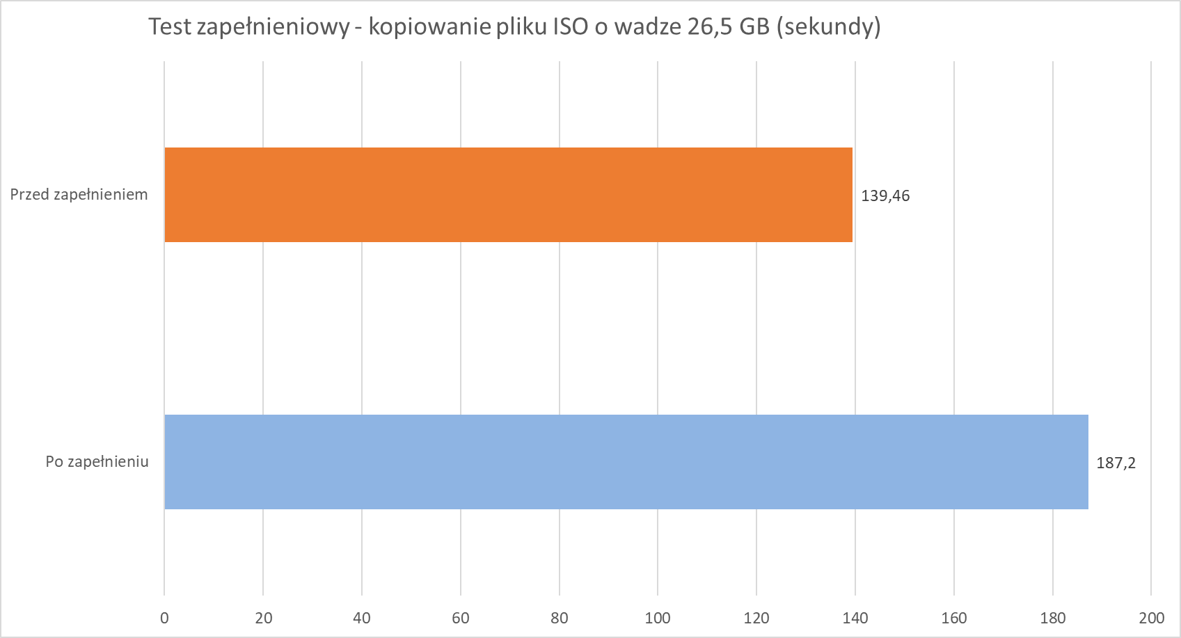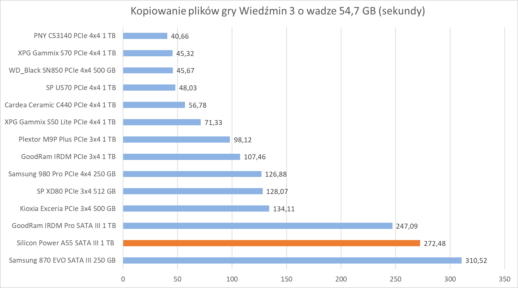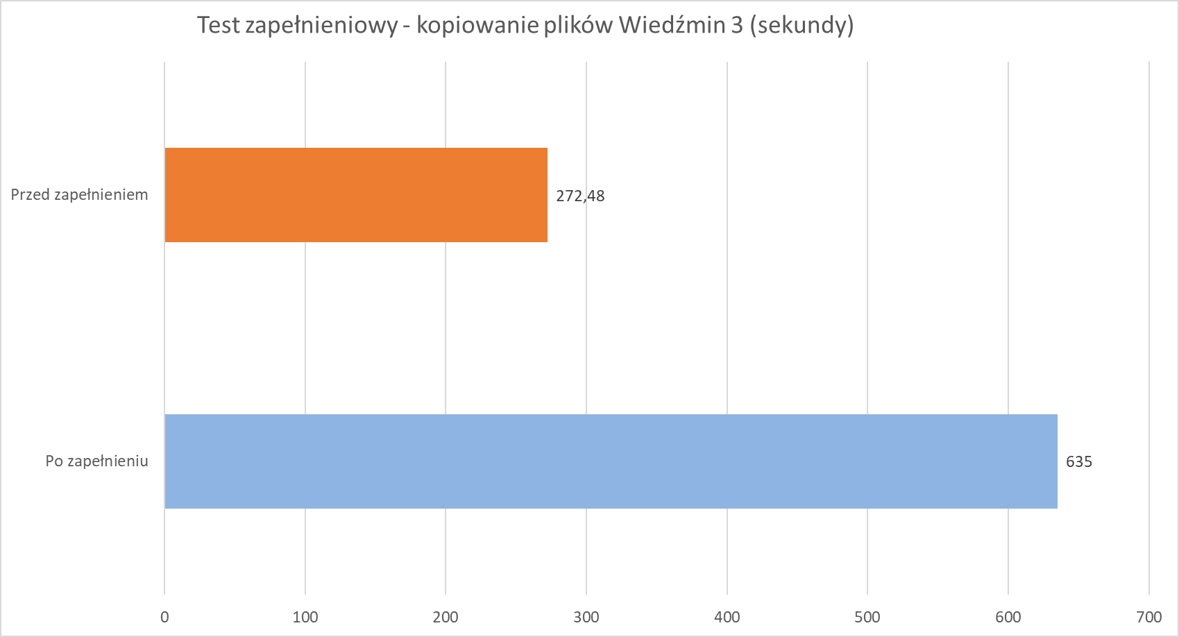 Wychodząc już poza ranking, sprawdziliśmy jak Silicon Power A55 radzi sobie z zapełnieniem około 95% pojemności. Wtedy jest źle. Chociaż benchmarki tego nie wykazały, to kopiowanie plików jasno wskazało, że przy braku możliwości zamiany trybu kości TLC na SLC przez zapełnienie dysku, kopiowanie obu plików wydłuża się znacząco. W przypadku Wiedźmina czas ten jest wydłużany ponad dwukrotnie.