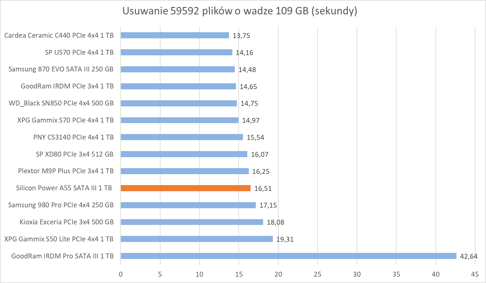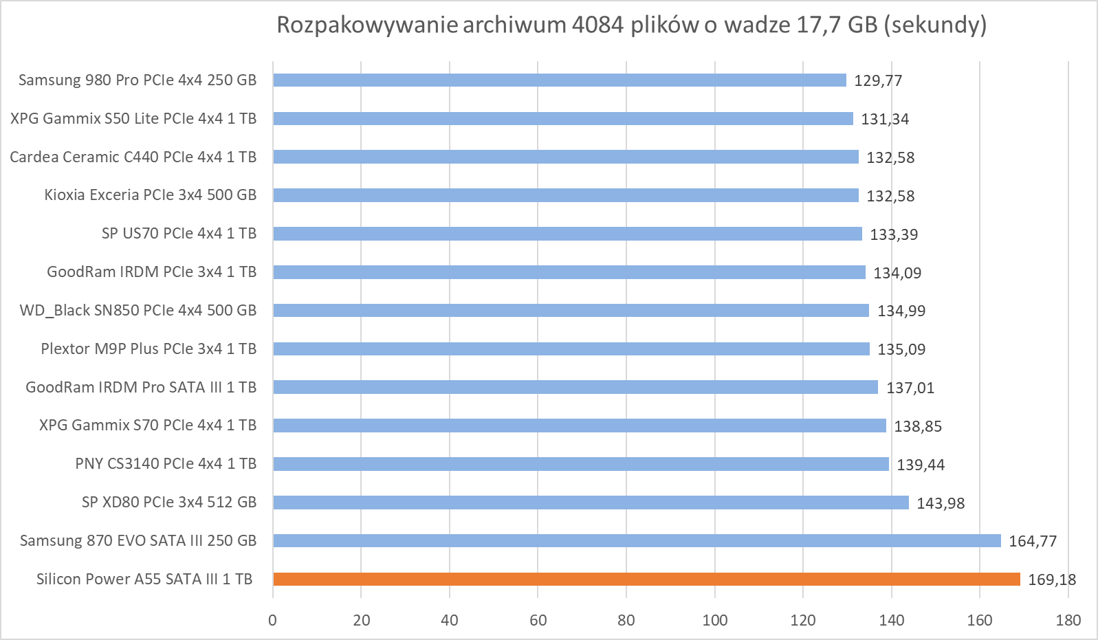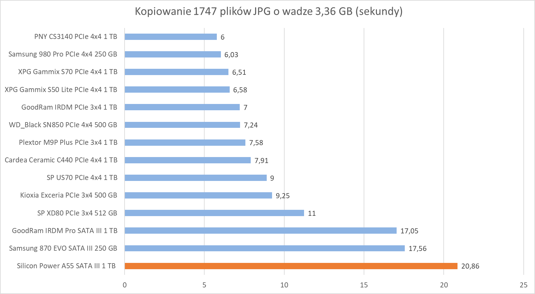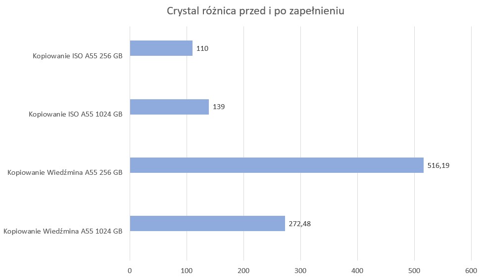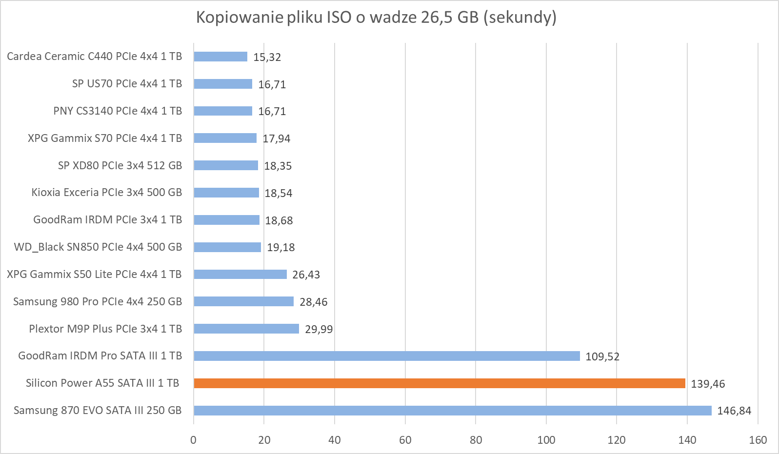 Wychodząc już poza ranking, sprawdziliśmy jak Silicon Power A55 radzi sobie z zapełnieniem około 95% pojemności. Wtedy jest źle. Chociaż benchmarki tego nie wykazały, to kopiowanie plików jasno wskazało, że przy braku możliwości zamiany trybu kości TLC na SLC przez zapełnienie dysku, kopiowanie obu plików wydłuża się znacząco. W przypadku Wiedźmina czas ten jest wydłużany ponad dwukrotnie.