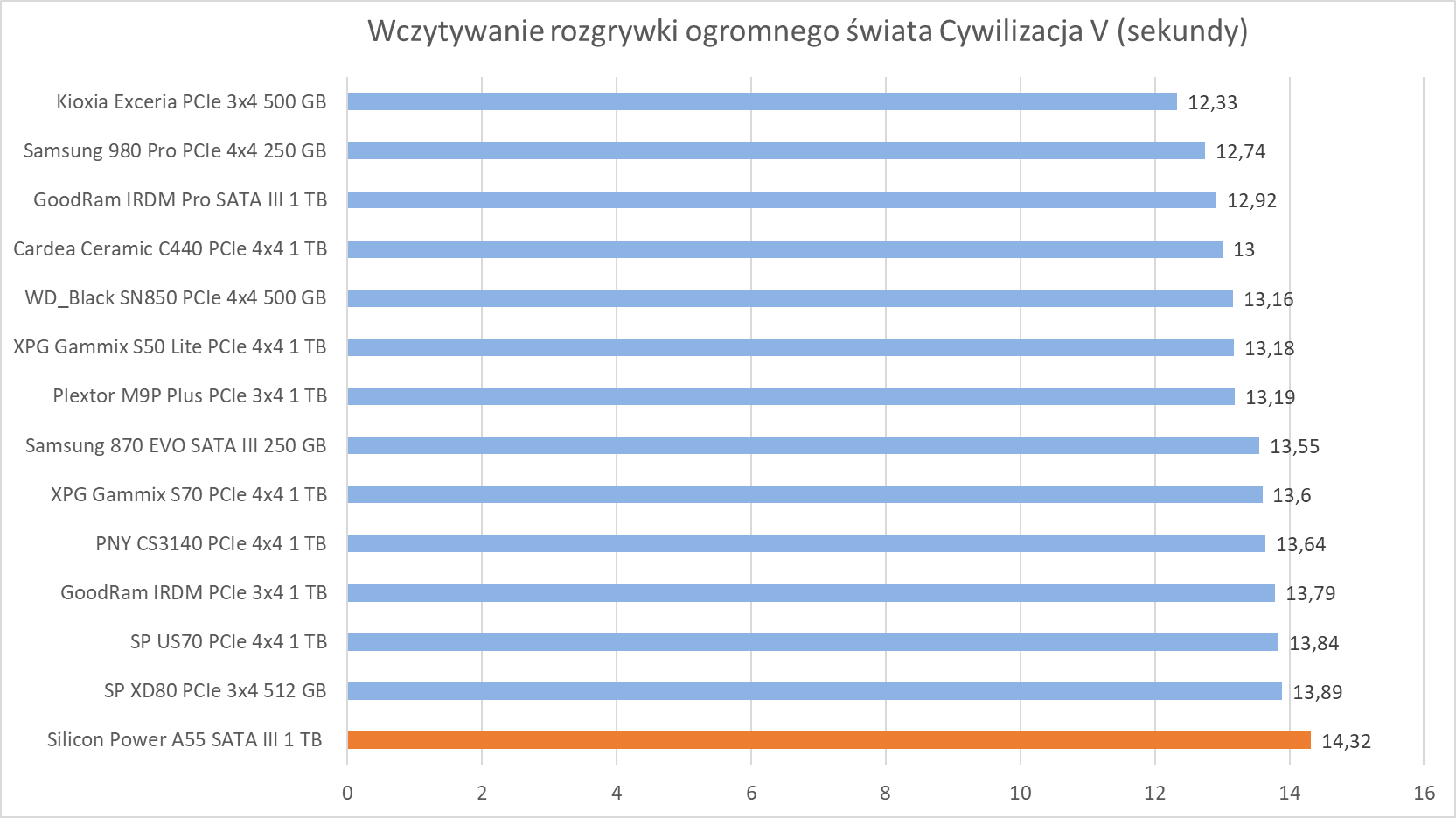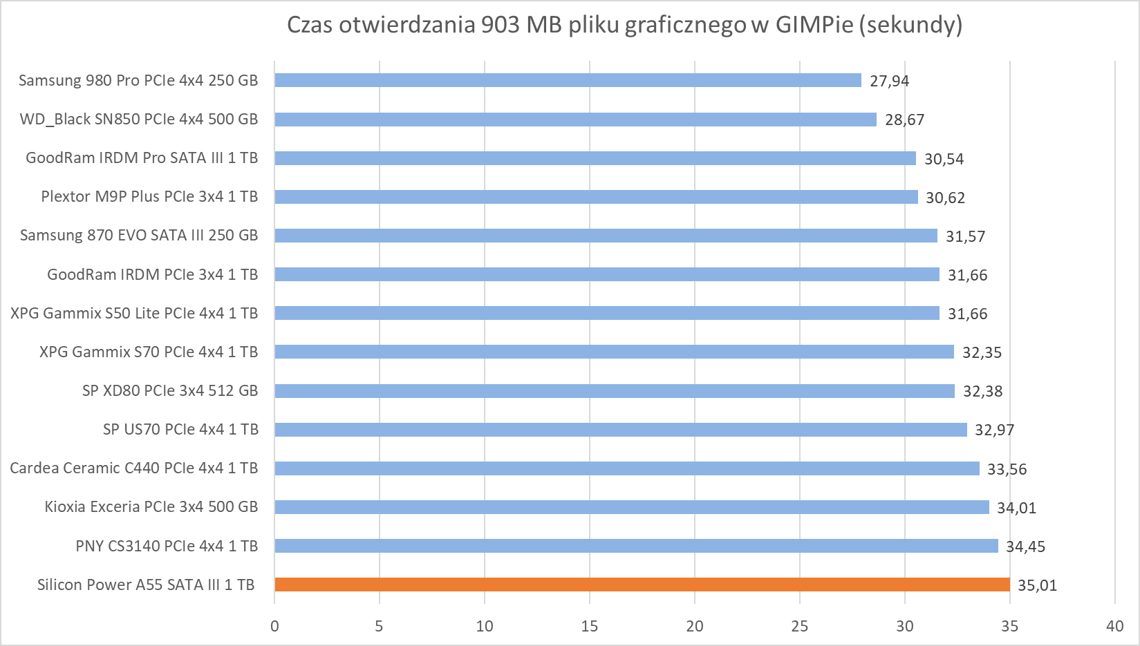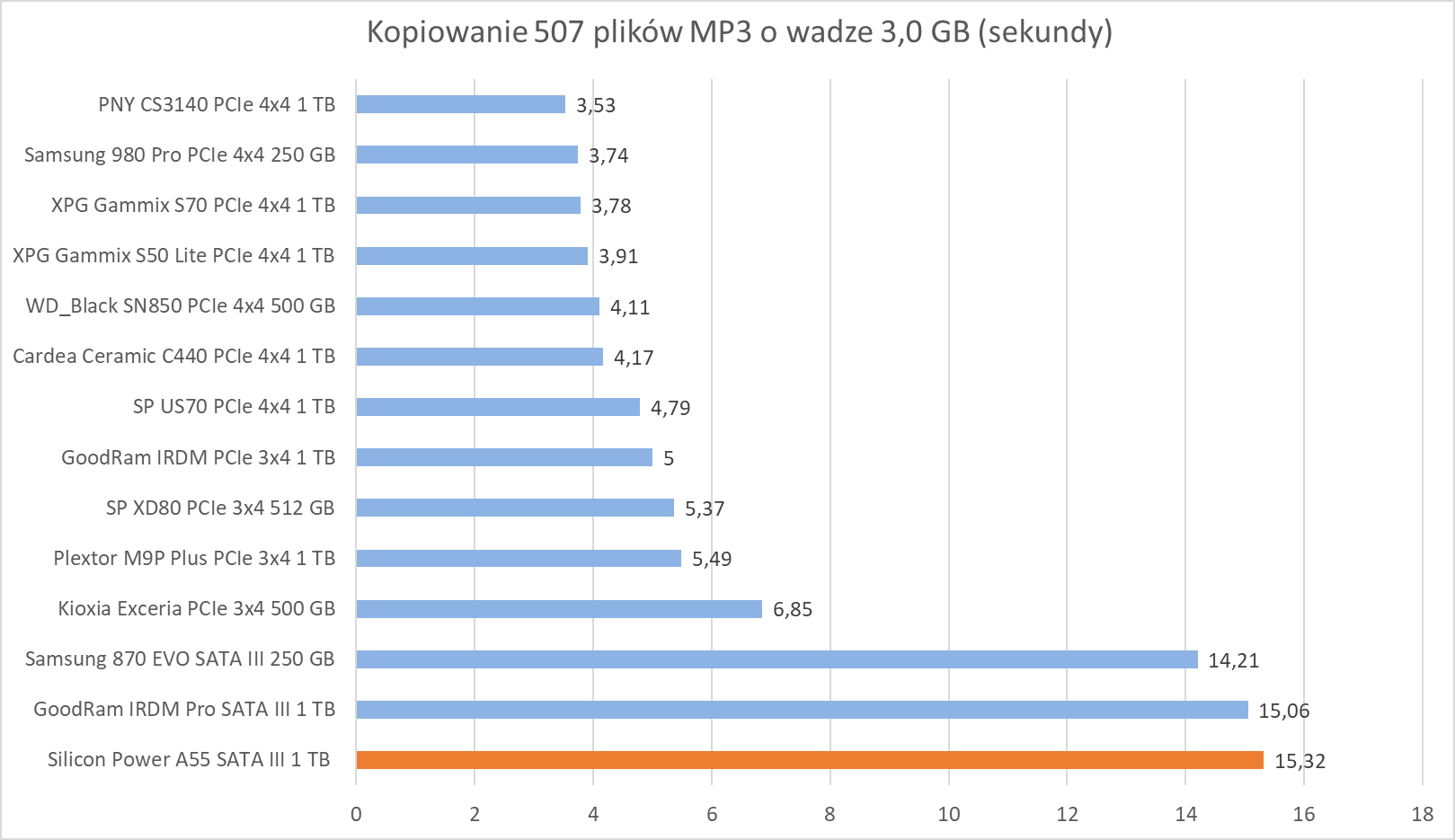 Wychodząc już poza ranking, sprawdziliśmy jak Silicon Power A55 radzi sobie z zapełnieniem około 95% pojemności. Wtedy jest źle. Chociaż benchmarki tego nie wykazały, to kopiowanie plików jasno wskazało, że przy braku możliwości zamiany trybu kości TLC na SLC przez zapełnienie dysku, kopiowanie obu plików wydłuża się znacząco. W przypadku Wiedźmina czas ten jest wydłużany ponad dwukrotnie.