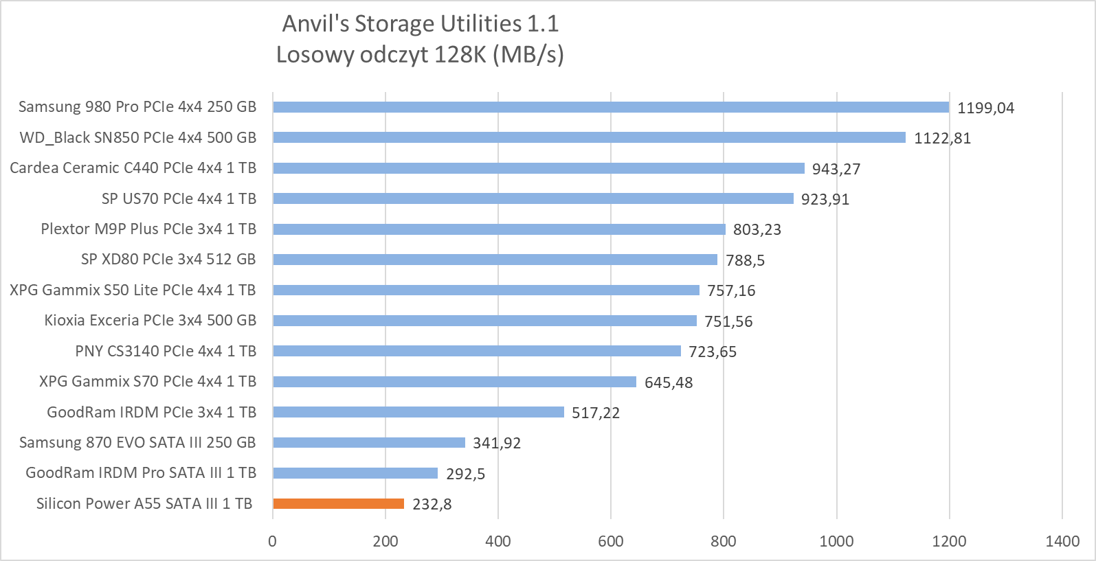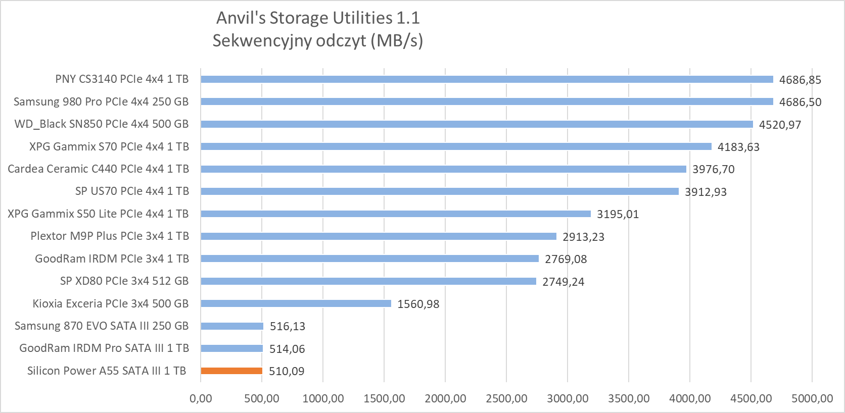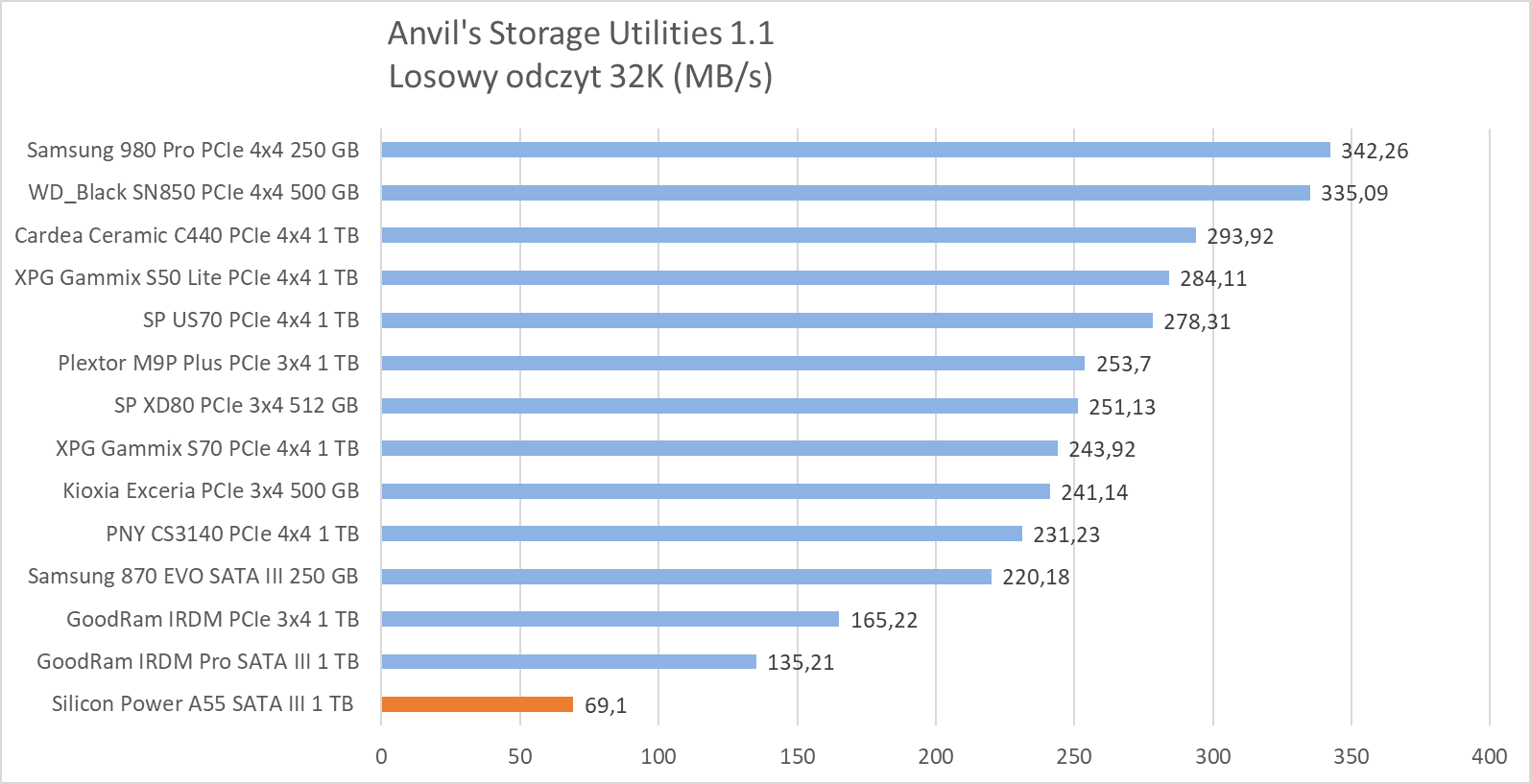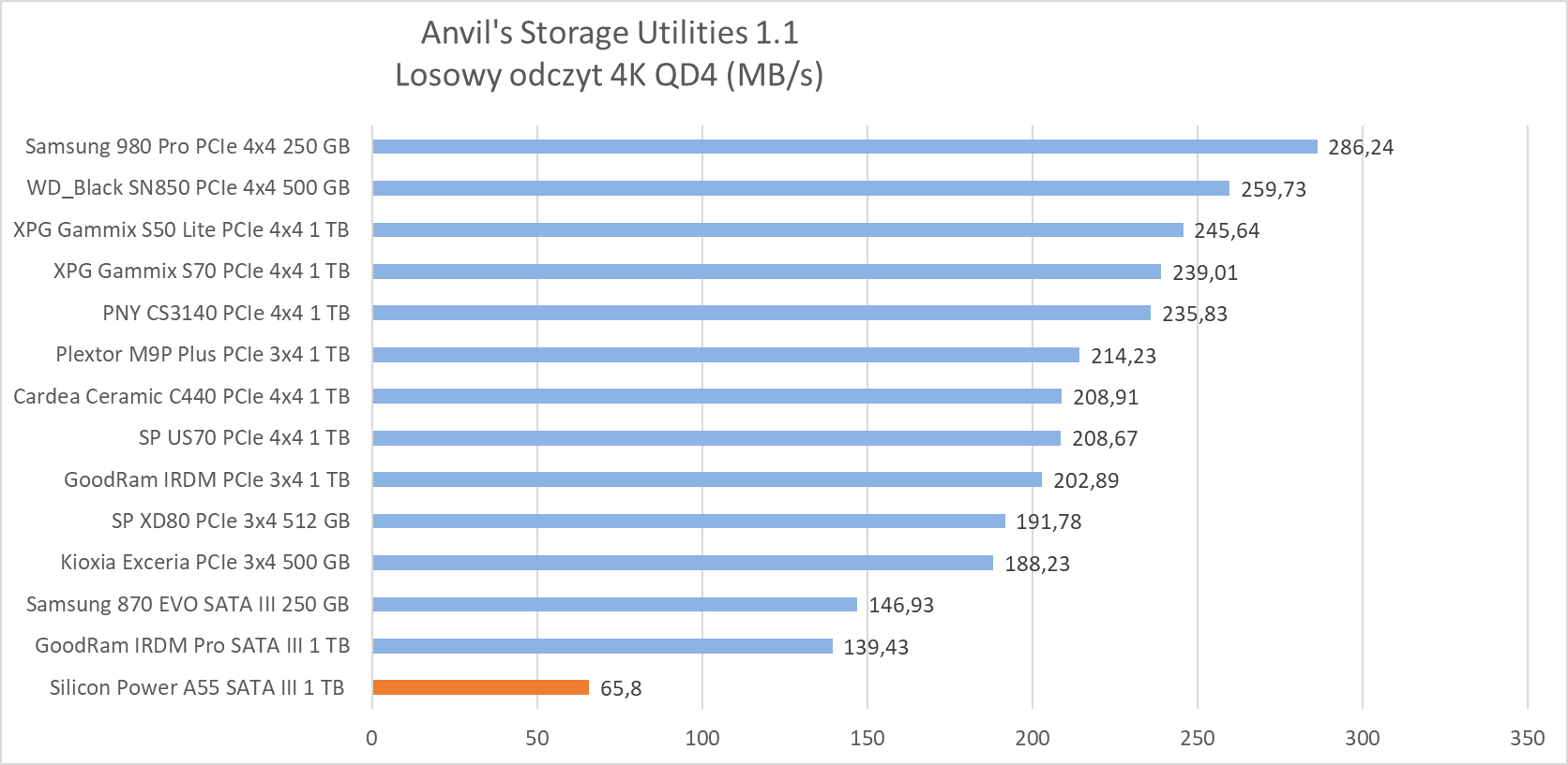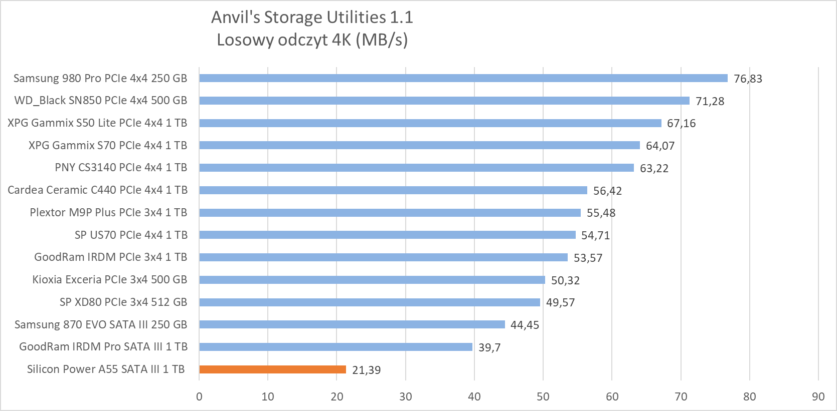 Jak więc Silicon Power A55 sprawdza się w syntetycznych testach? Najsłabiej w naszym rankingu, jako że A55 piastuje nieustannie najniższe miejsce na wykresach.