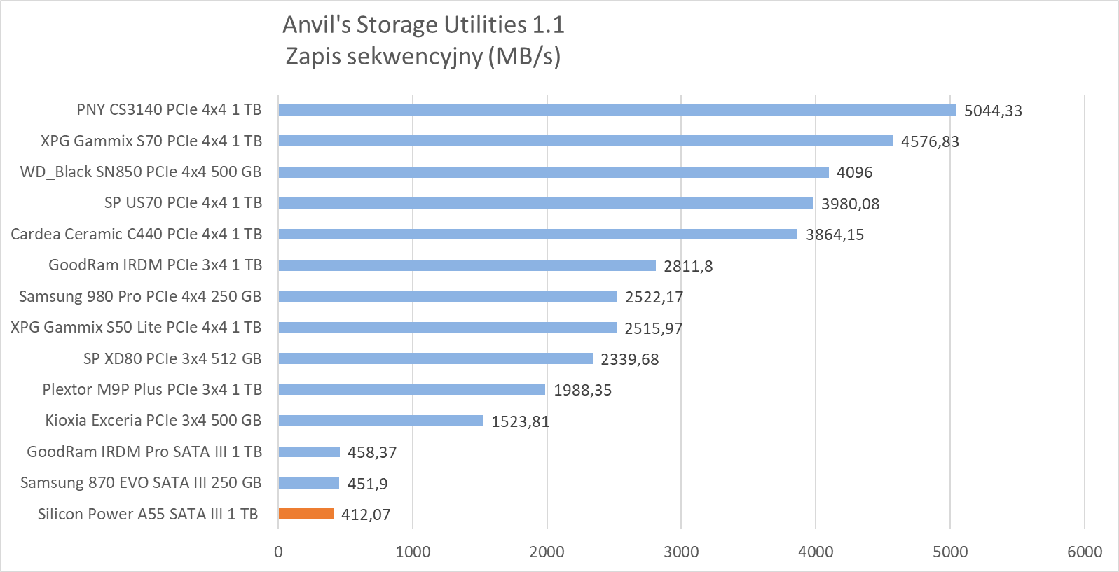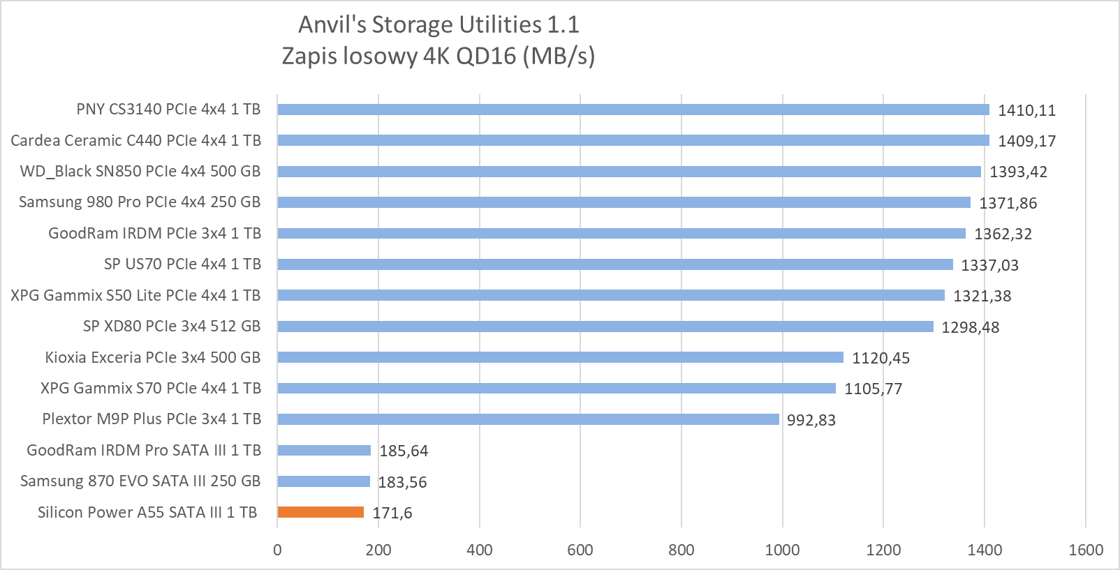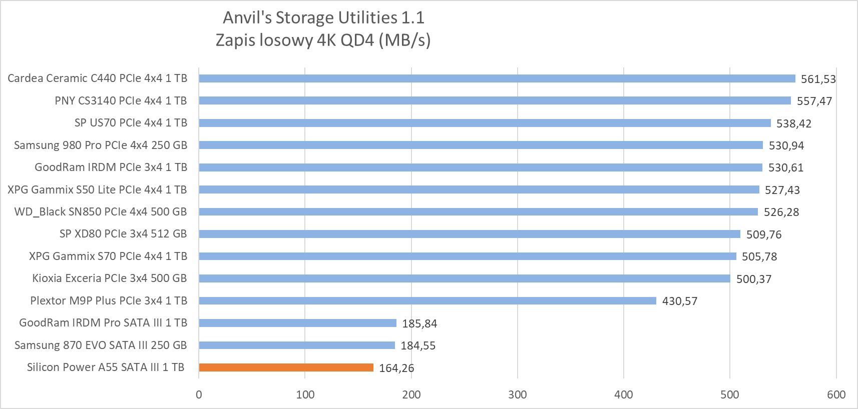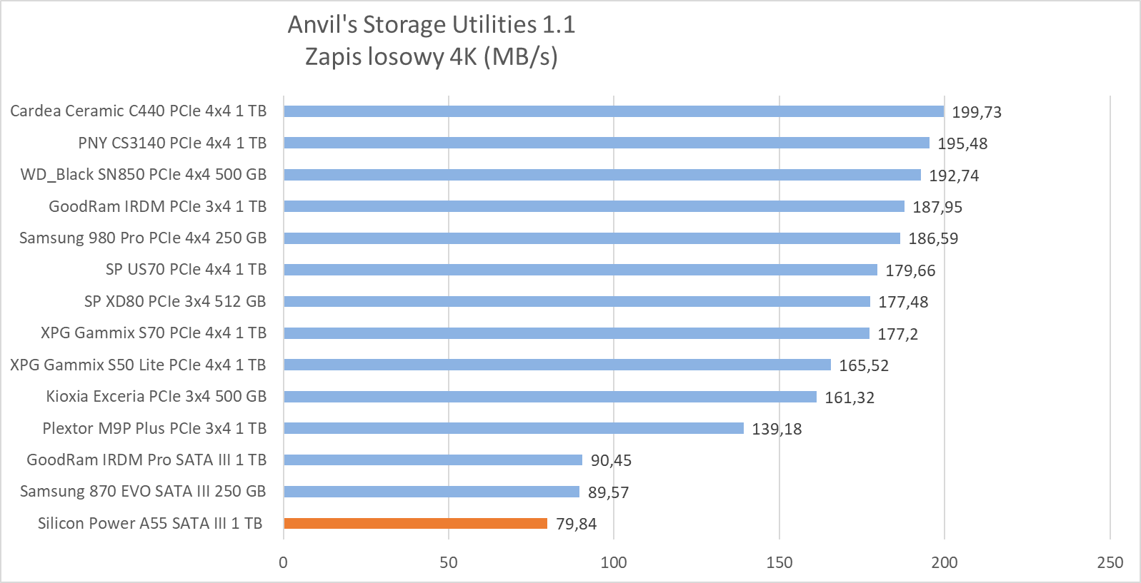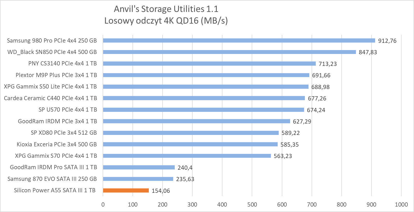 Jak więc Silicon Power A55 sprawdza się w syntetycznych testach? Najsłabiej w naszym rankingu, jako że A55 piastuje nieustannie najniższe miejsce na wykresach.