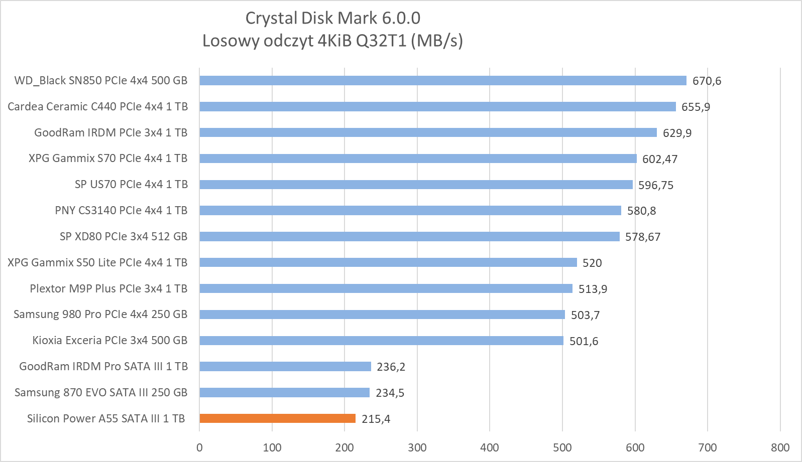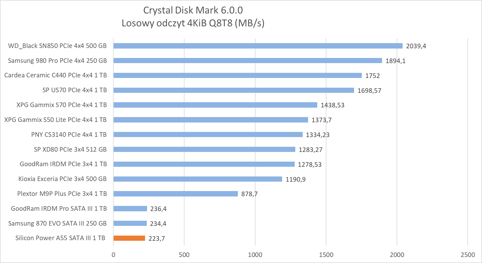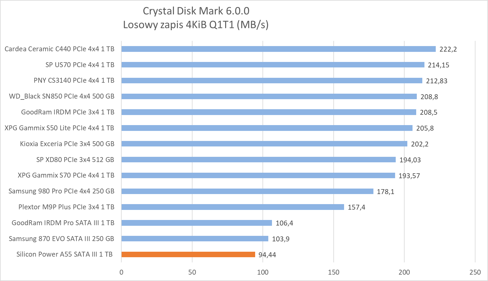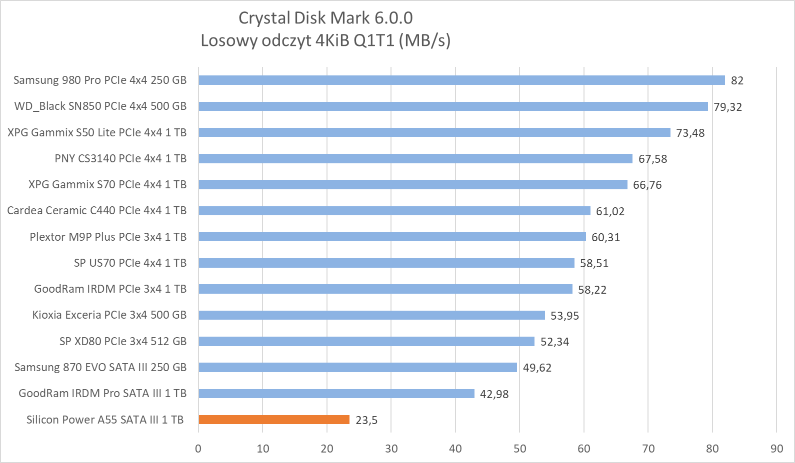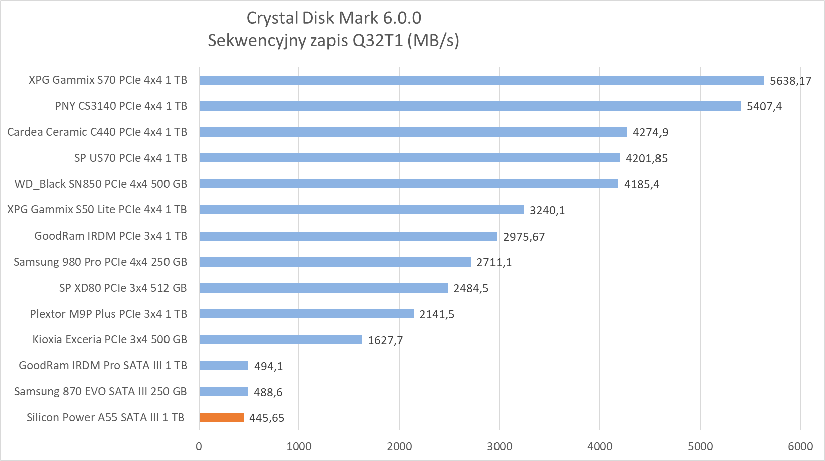 Jak więc Silicon Power A55 sprawdza się w syntetycznych testach? Najsłabiej w naszym rankingu, jako że A55 piastuje nieustannie najniższe miejsce na wykresach.